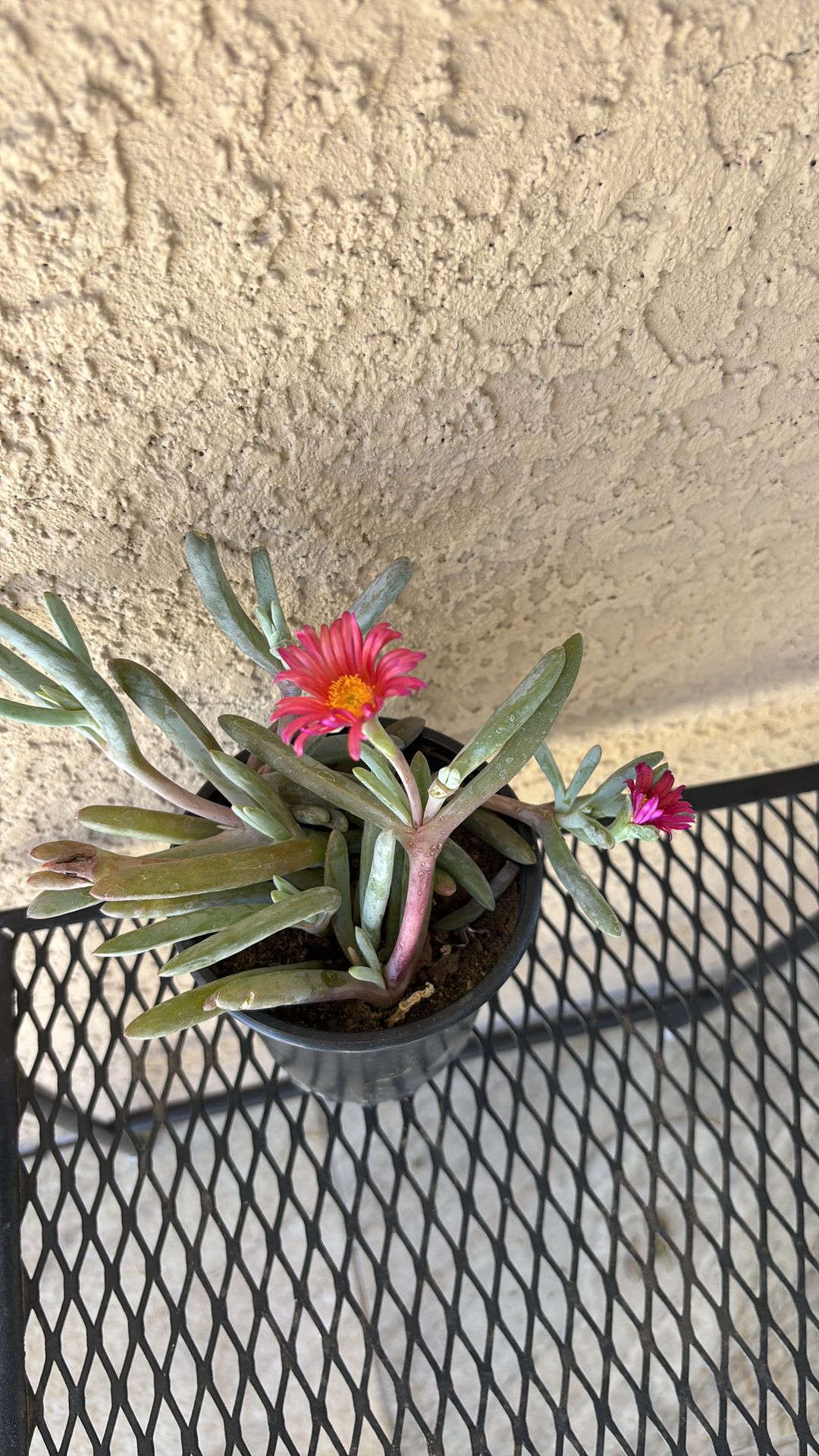 This is the pink variety, drought tolerant once established. Blooms from spring to fall. It is a low growing ground cover. I have several available. I also have Mexican palm tree, and a Mexican purple petunias, which are a perennial.