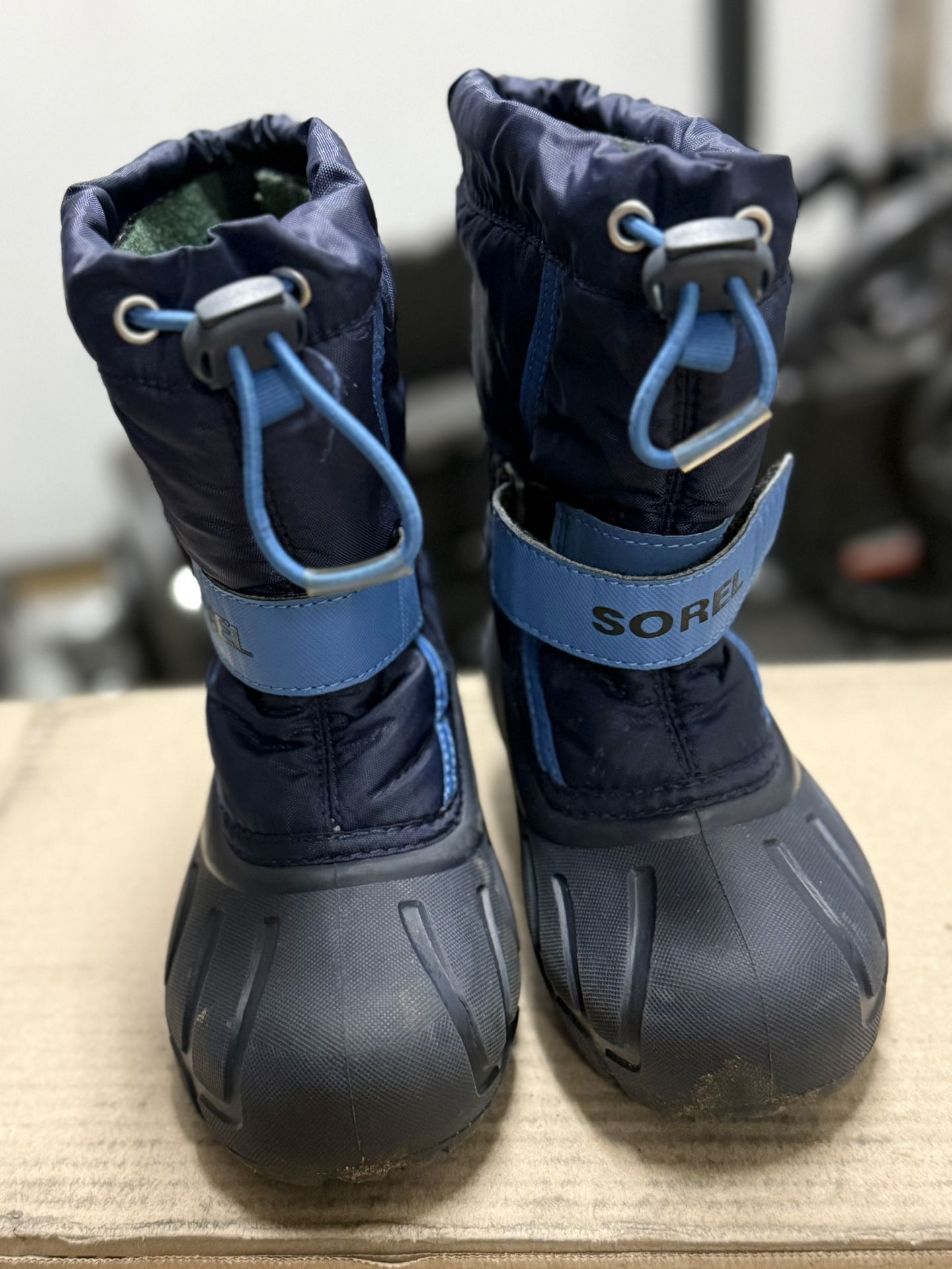 Awesome Sorel kids snow boots! Navy blue color with light blue accents. Size USA 11. Has drawstring at top and velcro strap for snug fit. Warm lining inside for cold weather. Perfect for playing in the snow or just keeping little feet toasty. Pickup in Lathrop.