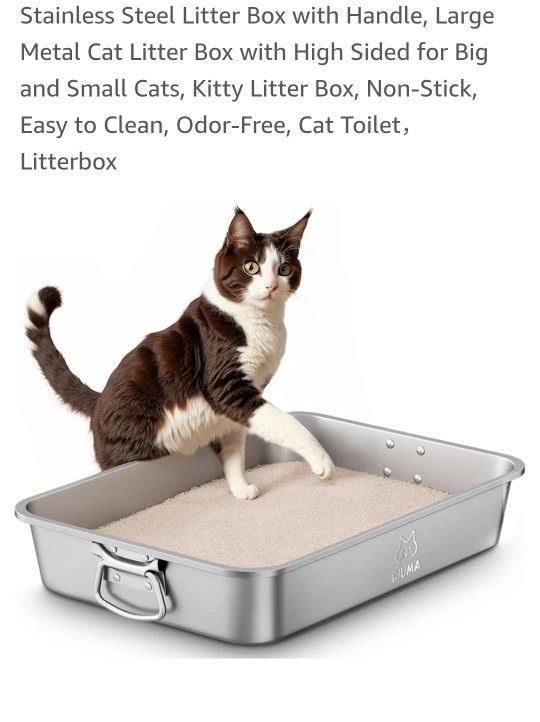 Stainless Steel Litter Box with Handle, Large Metal Cat Litter Box with High Sided for Big and Small Cats, Kitty Litter Box, Non-Stick, Easy to Clean,