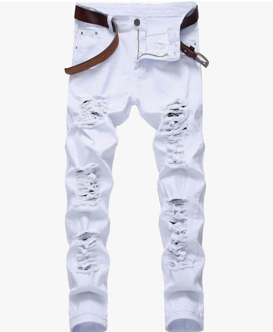 Men Ripped Jeans, Slim Fit Straight Leg, Denim Pants with Holes