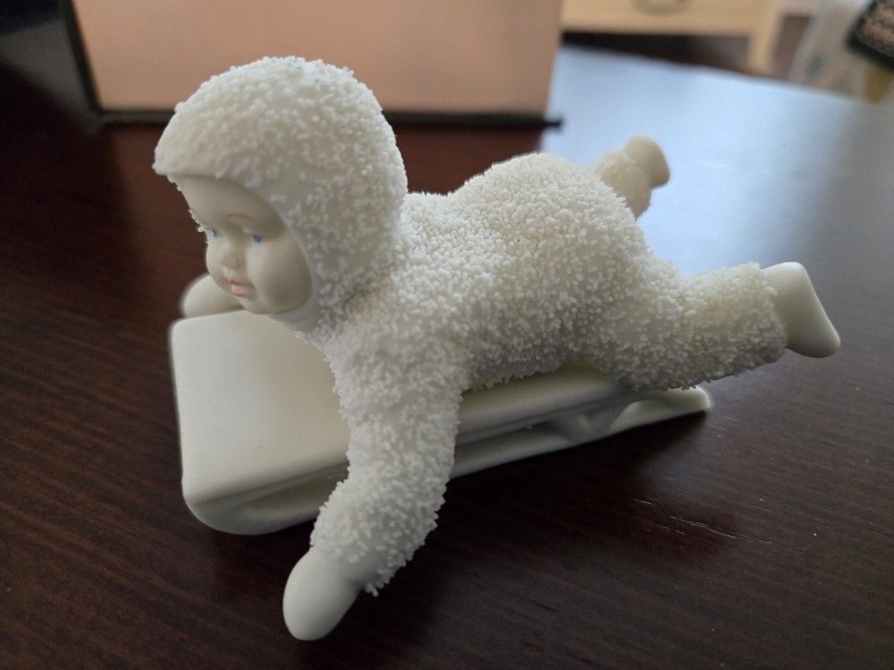 Adorable porcelain baby figurine in a textured snowsuit on a sled, 4" long, 2.5" tall.