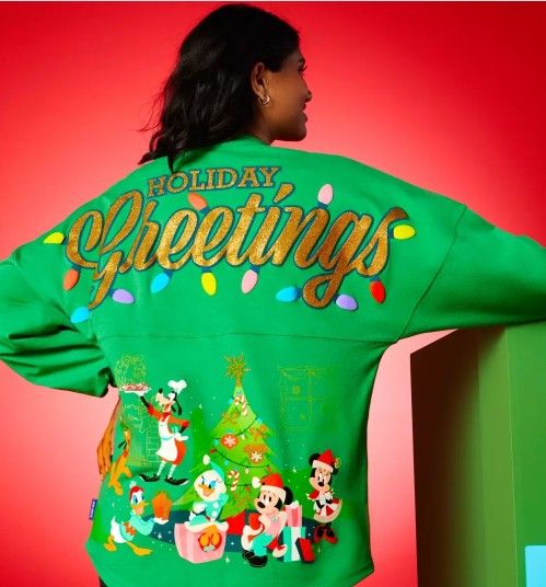 THIS SPECIFIC DESIGN IS SOLD OUT ON THE WEBSITE please do not ask for website price match ***AVAILABLE IN LARGE AND XLARGE*** Price firm no trades PRODUCT DETAILS UNISEX This season, make unforgettable memories in our festive pullover Spirit Jersey featuring a Fantasyland of Disney Classics Christmas characters on the front and back–plus glittering Mickey Mouse ornament icon on front and ''Holiday Greetings'' message on back shoulder. Magic in the details Pullover Spirit Jersey Screen art front and back midsection Front characters include Tinker Bell, Peter Pan, Bambi, Thumper, Alice and Cheshire Cat Back characters include Santa Mickey, Mrs. Santa Minnie, Donald, Daisy, Goofy and Pluto Glitter Mickey Mouse ornament icon on chest Glitter 'Holiday Greetings'' message on back shoulder Decorative glitter accents Medium weight fabric Dropped shoulders Pieced yoke Long sleeves Ribbed crew neck and cuffs Shirttail hem Woven Spirit Jersey label at side hem Disney label at front hem Part of the Disney Classics Christmas Collection The bare necessities 100% cotton