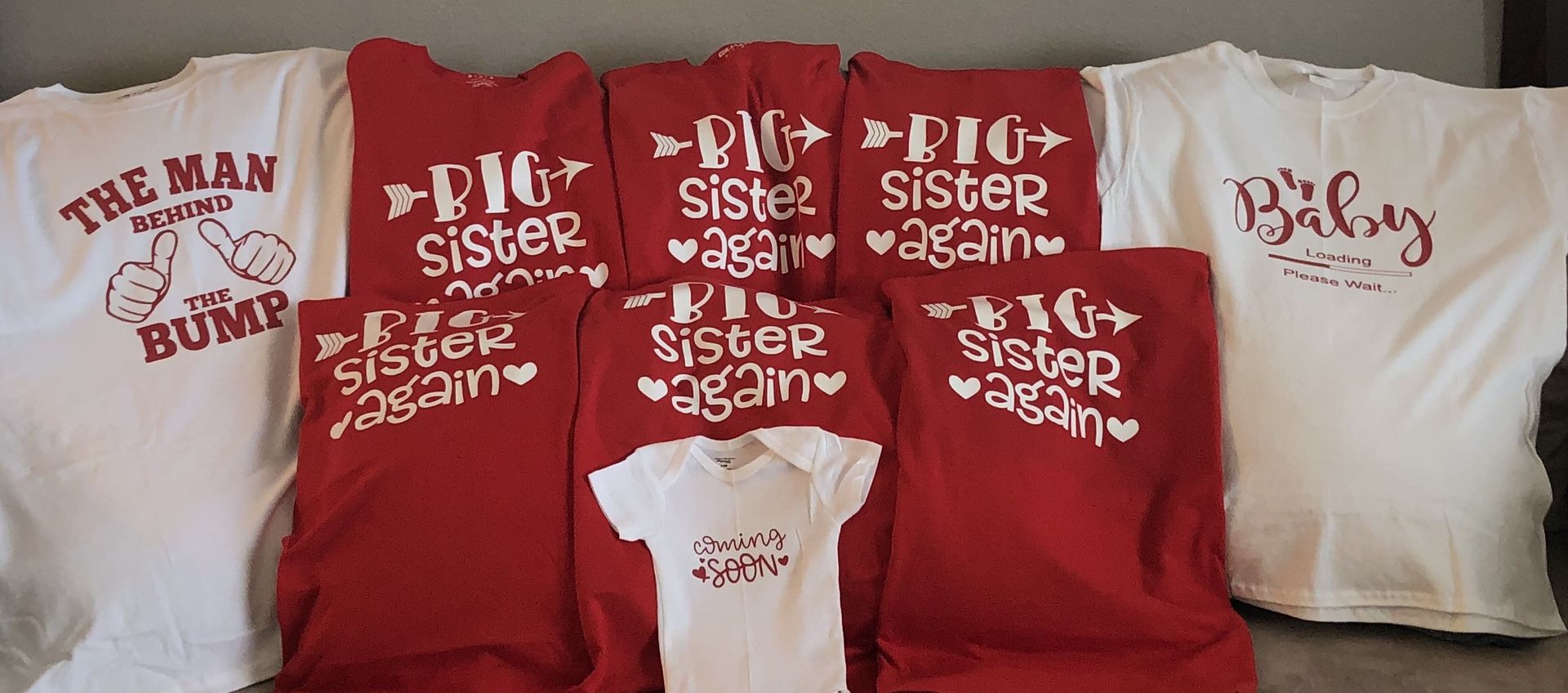 Announcing your pregnancy with Shirts Deposit required. Prices are firm!!! Serious buyers only, thanks! Onesies start at $12 Kids t-shirts start at $15 Adultd Size S - XL start at $18 ***Custom design*** I customize any kind of shirts. Whatever you think of ・Couple Shirts ・Family Shirts ・Friends/group shirts ・Reunion Shirts ・Corporate Shirts ・any personalized shirts {Made to order} Located in Rancho Cucamonga