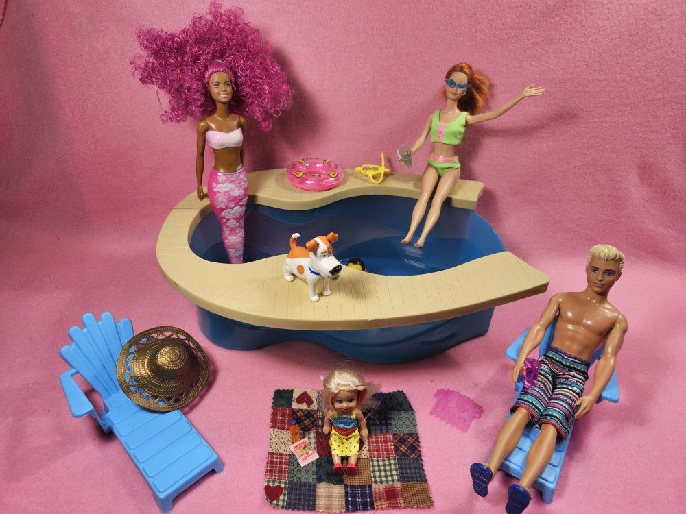 Includes a pool, 4 dolls, a dog and all the furniture and accessories shown.