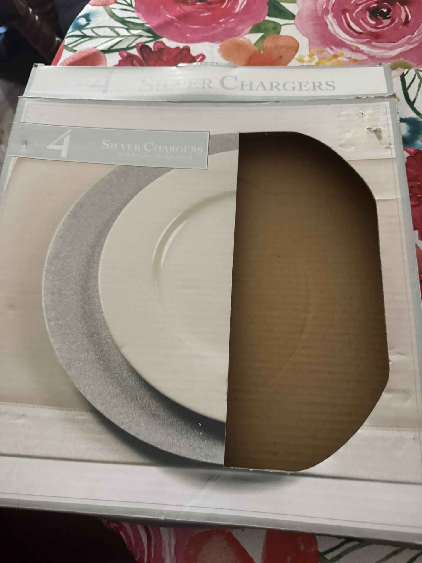 4 13” silver sparkle charger plates like new one has a little tiny scratch as in picture. Great for a wedding or a display of some type Pickup only 76137