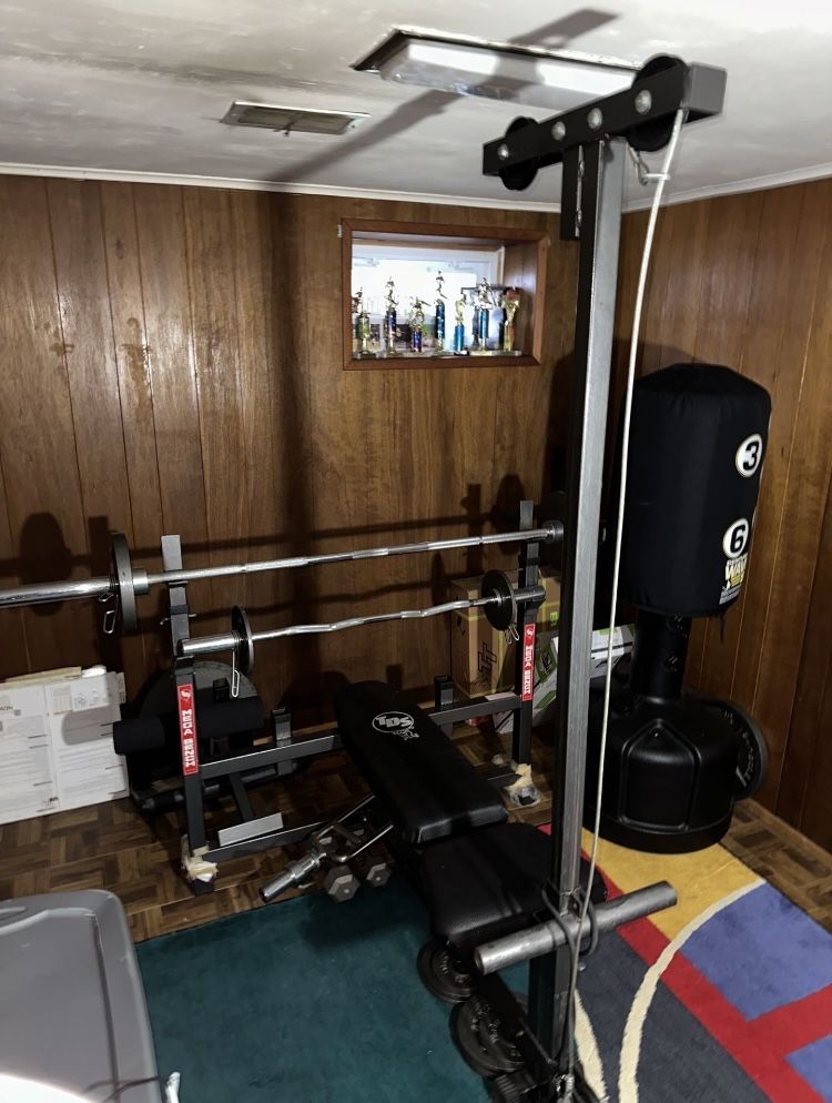 Heavy duty TDS adjustable bench with attached bench press rack. Bench adjusts to multiple positions (decline, flat, upright and incline). The rack can also be used as a squat rack since the spotter arms are height adjustable. Also comes with a leg attachment for doing leg curls and leg extensions as well as a preacher curl pad attachment to do bicep curls. You can do almost everything with this unit. Perfect for a quality home gym setup. Olympic plates and barbell NOT included in price but can be included for an additional fee. Weight, weights, bumper plates, dumbbells, squat rack, adjustable bench, workout, exercise, train, safety spotters, Olympic barbell, curl bar