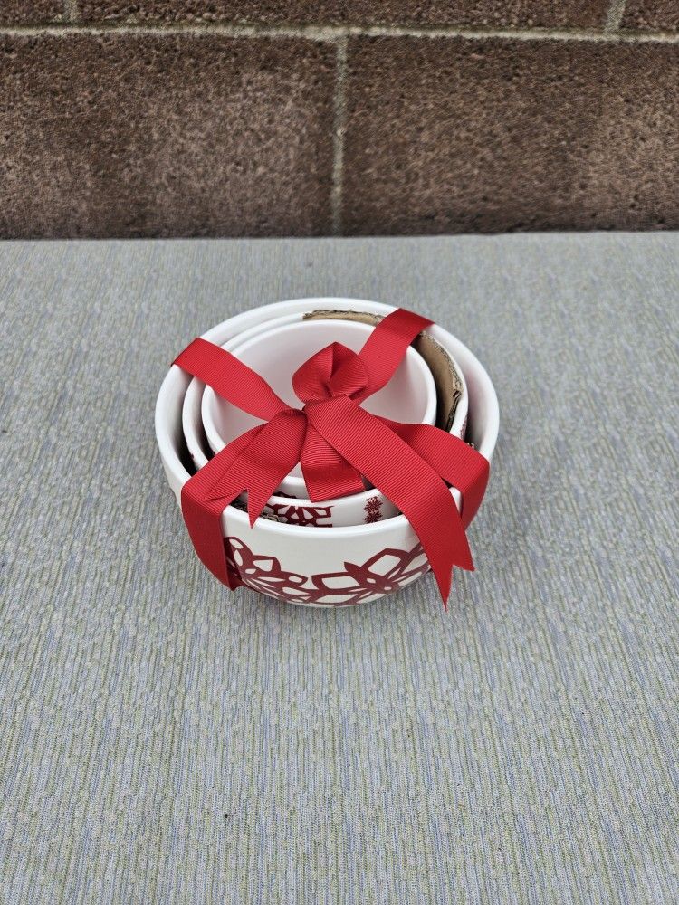 Add a festive touch to your holiday table with this beautiful set of 3 nesting bowls from Crate & Barrel! Featuring a charming Nordic red and white snowflake design, these ceramic bowls are perfect for serving dips, candies, or appetizers. Brand: Crate & Barrel Condition: Used like new Sizes: Includes three nesting sizes (approx. 4", 5", and 6" diameters) Care: Dishwasher safe Features: Space-saving nesting design; includes original red ribbon for gifting Perfect for Christmas entertaining or as a thoughtful hostess gift.