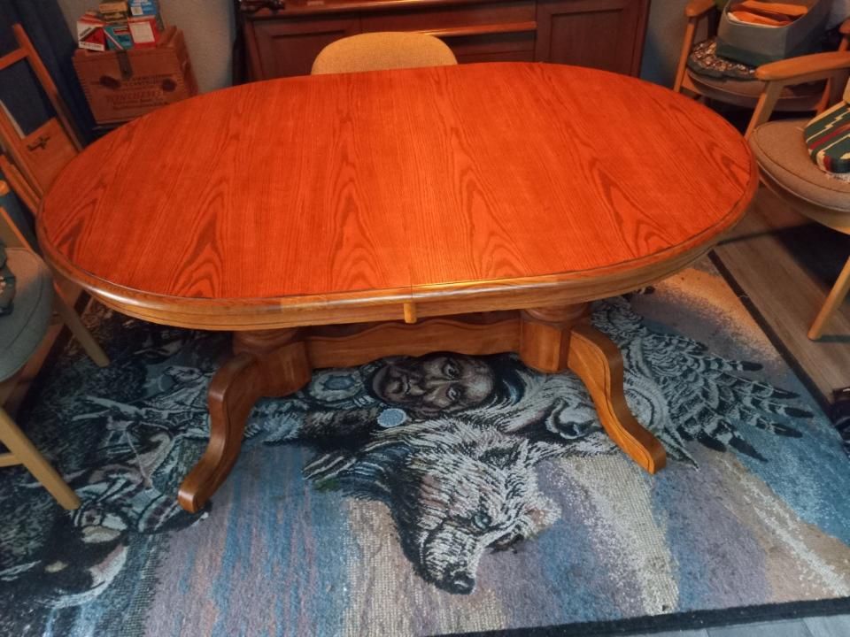Beautiful table in excellent condition, has large leaf that is tucked under table and another leaf. I was planning on painting the base and sanding top to natural wood. Base already prepped for paint