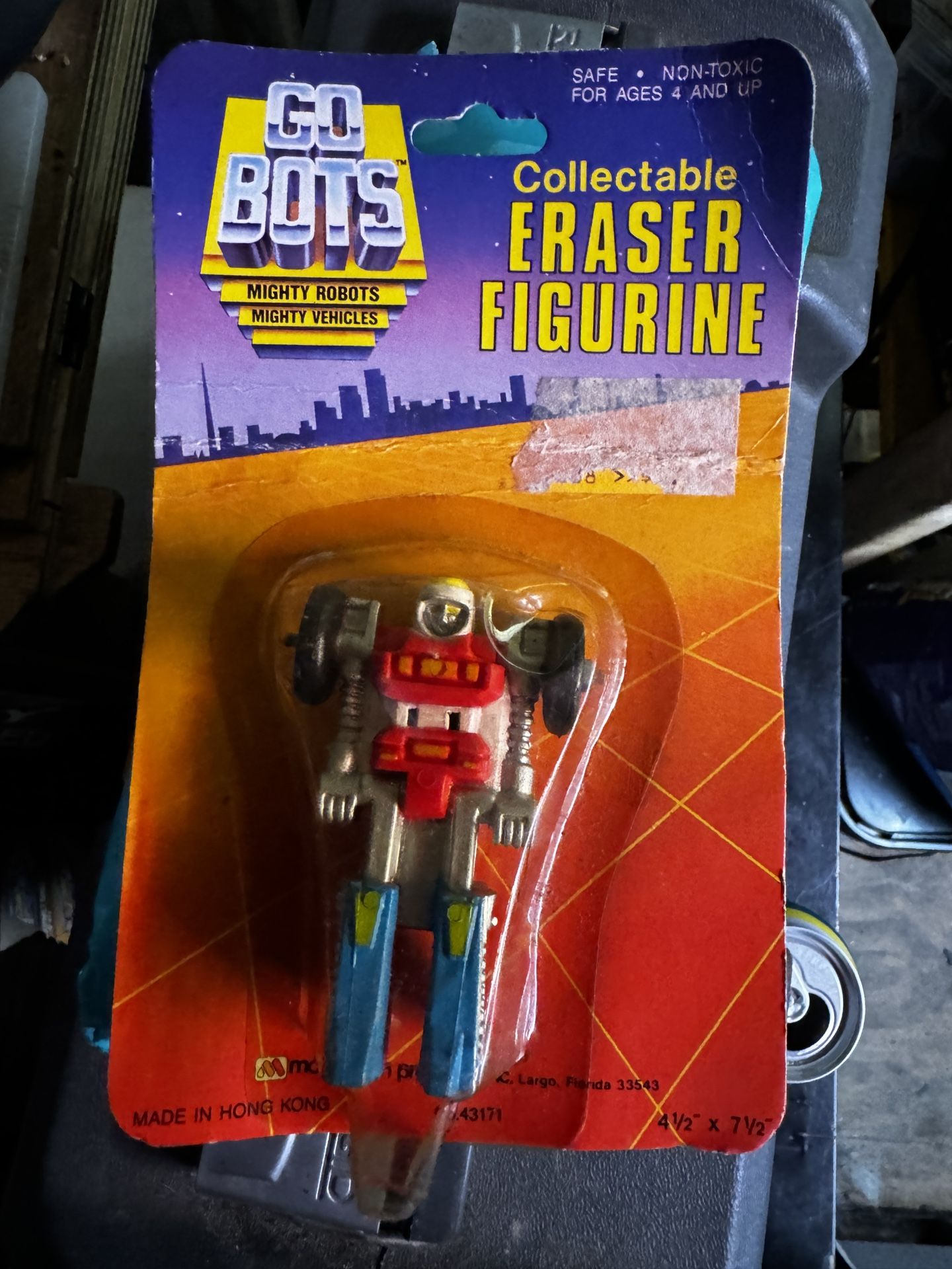 The 1984 Tonka Gobots Cy-Kill Eraser Figure Robot in its original packaging. It is a collectible item from the 1980s robot craze.
