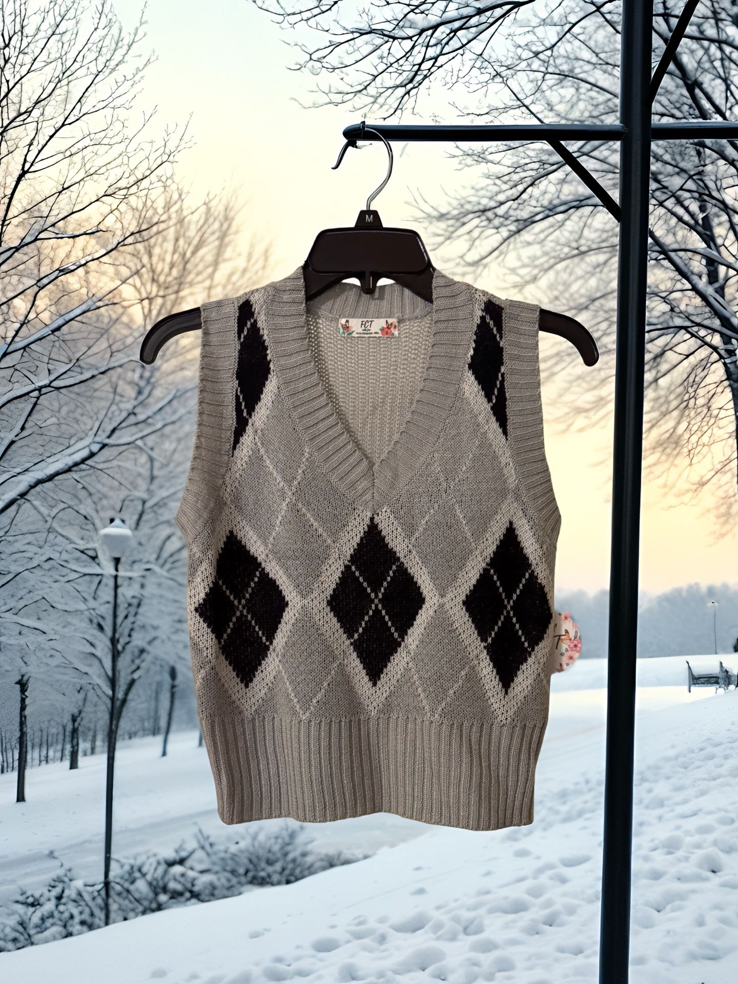 955-MMT. The FCT Argyle Knit Sweater Vest in black and gray, size small, is a stylish and versatile piece perfect for a variety of occasions. Made from acrylic material in a knit fabric type, this sleeveless vest features a flattering v-neckline. The combination of colors and classic argyle design adds a touch of sophistication to your wardrobe, making it ideal for travel, casual outings, or workwear. Embrace the theme of love in the winter, fall, and spring seasons with this trendy sweater vest from the brand FCT.