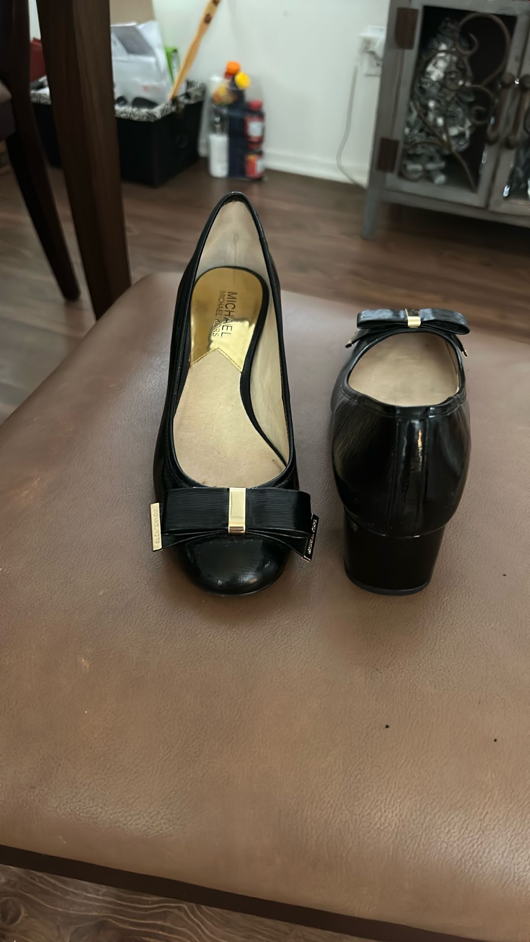 Beautiful, small chunky heel, elegant Michael Kors size 8, with a grow grain bow leather