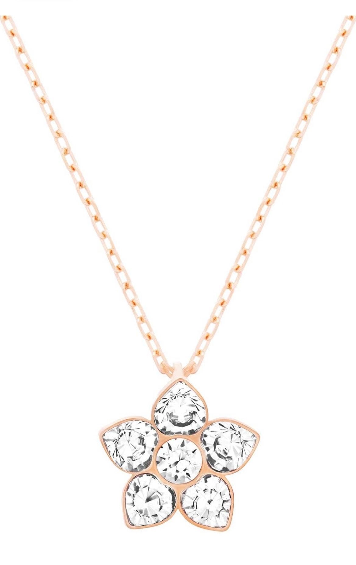 Rose-gold plated pendant featuring a delicate flower embellished with clear crystals. Never before worn Beautiful shine