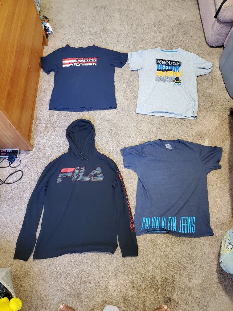 Preowned with flaws as seen in pics. Please observe pics carefully before you buy. Fila shirt is a size M mens which can fit a size XL boys. Selling all 4 for $10 or best offer