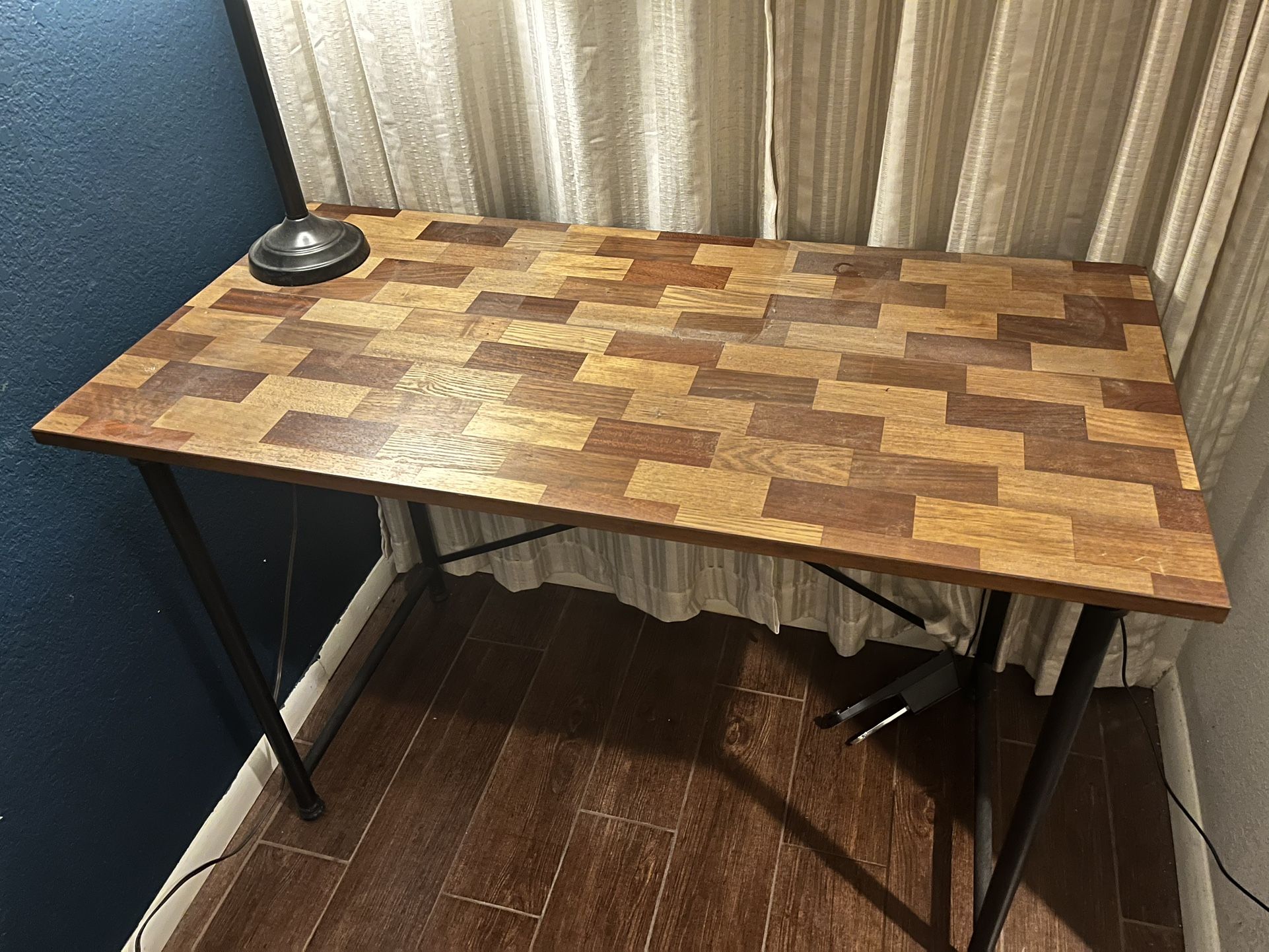 A like new wood and metal desk. It has a stylish wood block patterned top and an x-frame legs and back in black metal. Sturdy and stylish!