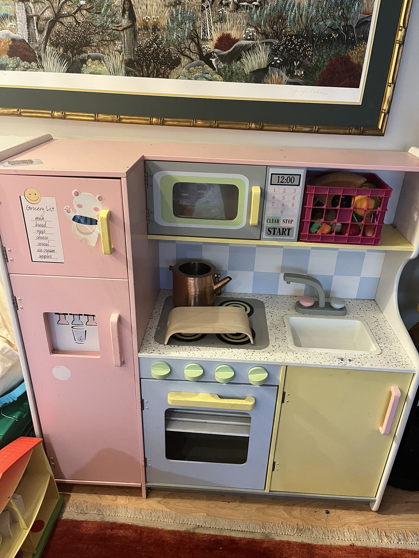 Wooden play kitchen set, still in good condition and safe for ages 4+, comes with food and utensils, for pick up only.