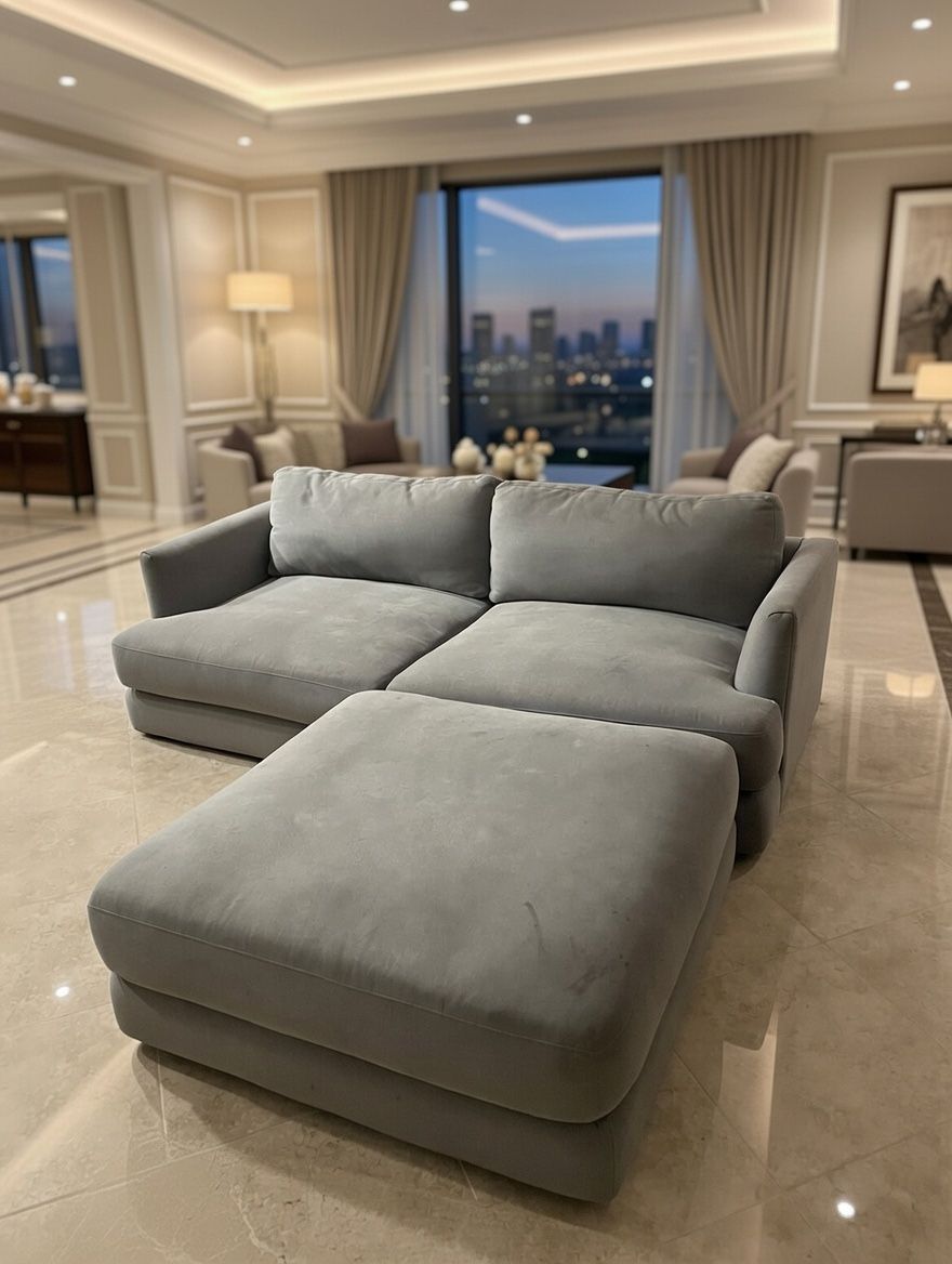 Used and good condition west elm sofa with ottoman. Needs cleaning, used with kids. Small tear on back left corner (see last pic) Comes with matching ottoman. Dimensions: ~81”x41”
