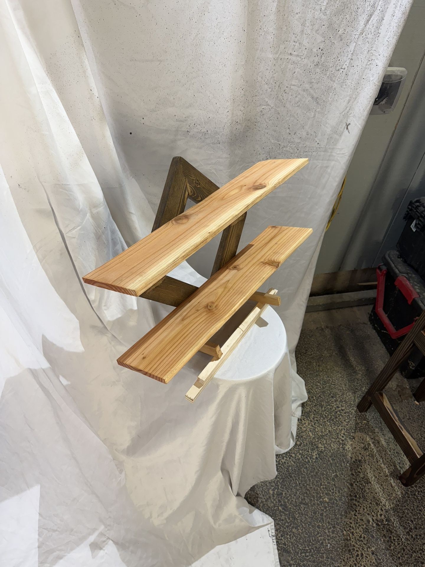26x18 inch custom wood shelf. Dark walnut back drop w/ natural shelves
