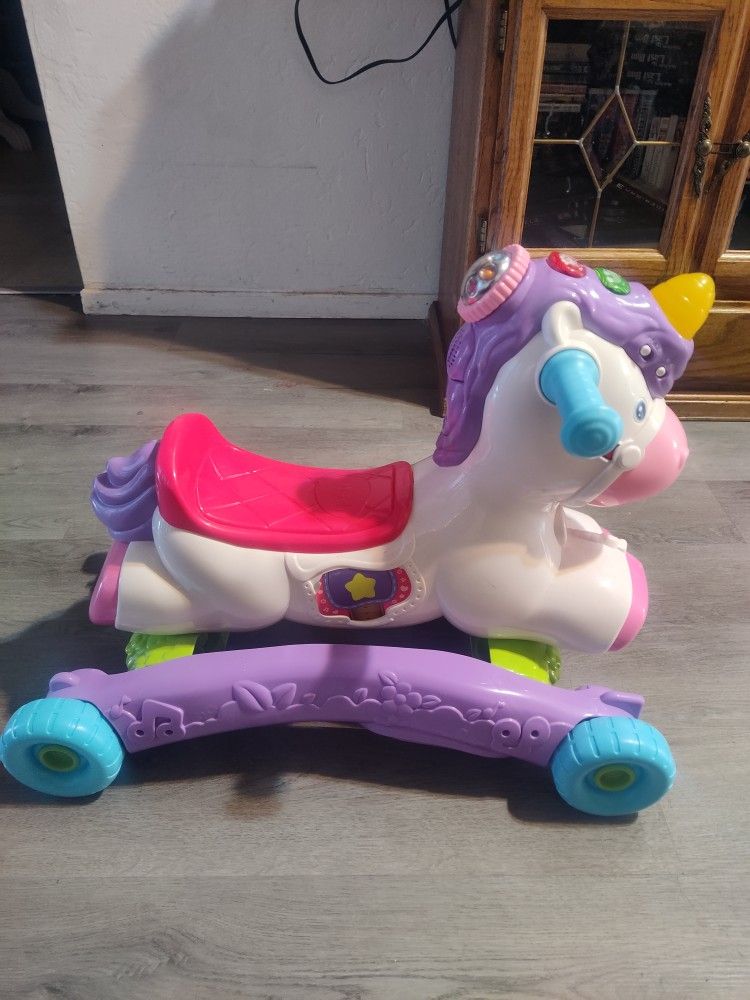 The VTech Prance & Rock Learning Unicorn Rocker Ride is a grow-with-me unicorn that can transform from a rocker to a ride-on in seconds. It has built-in motion sensors that respond with music and unicorn sounds.