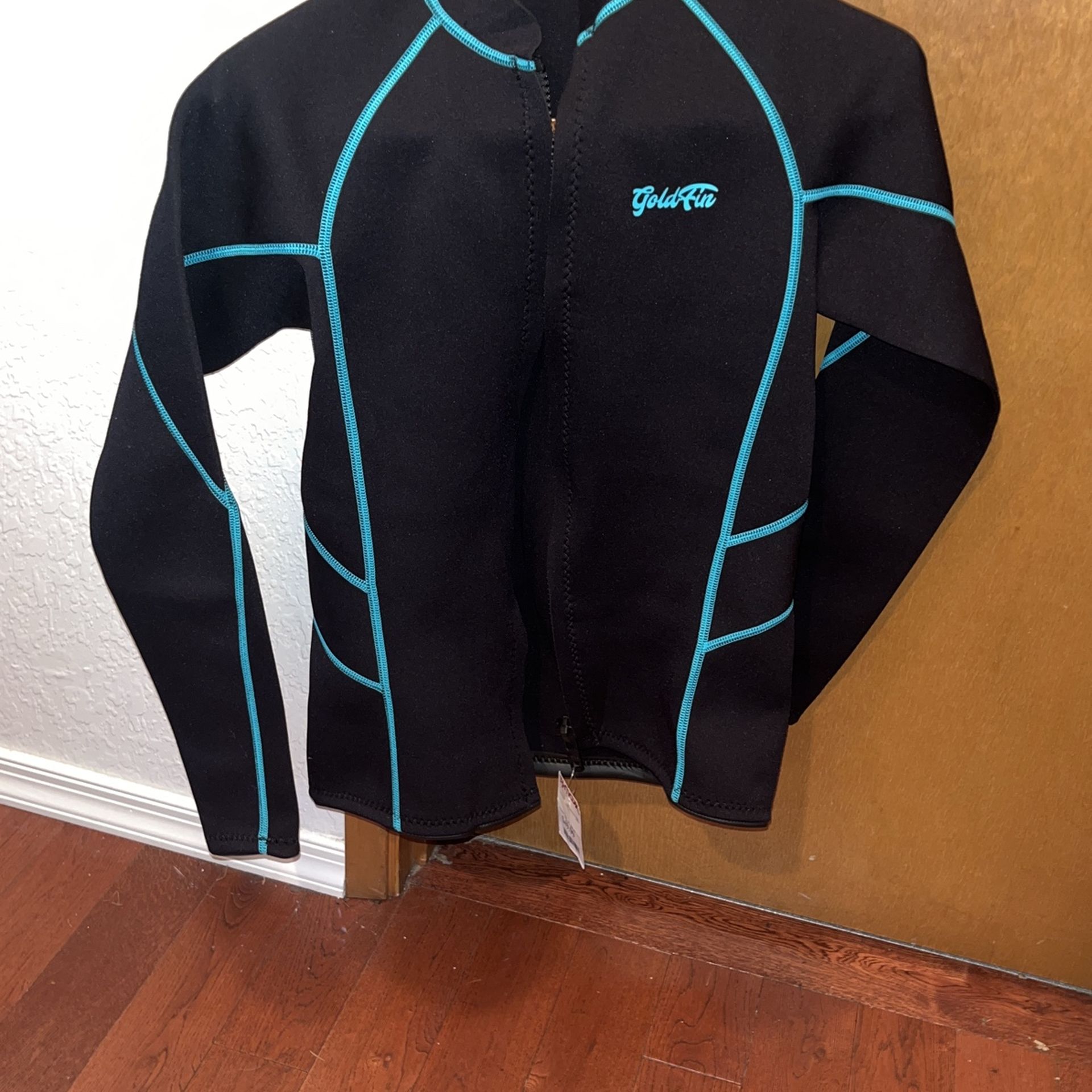 Thick for good insulation! It is marked Large but fits small. Great for year around swimming or any water sports! Never worn. Zippered jacket. OBO.