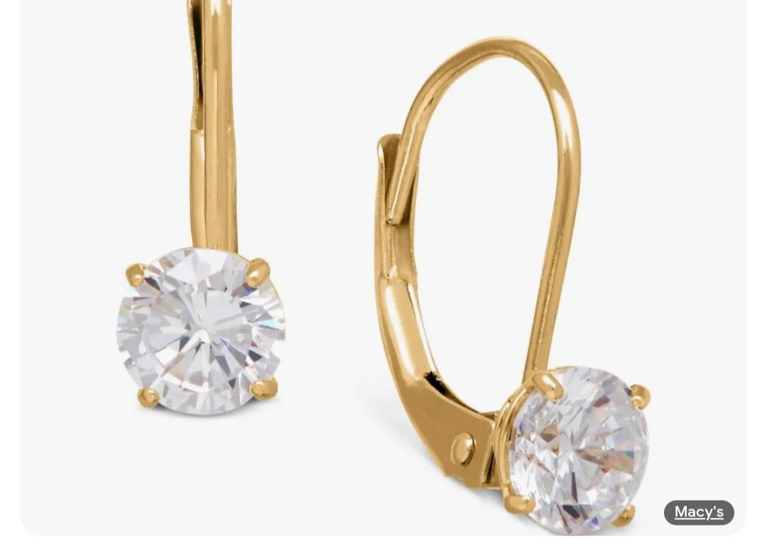 These chic earrings feature hoop designs fashioned from 14 karat yellow gold sparkling with 5mm round white cubic zirconia gemstones. Earrings have lever backs and measure 16mm long and 5mm wide. 30 obo