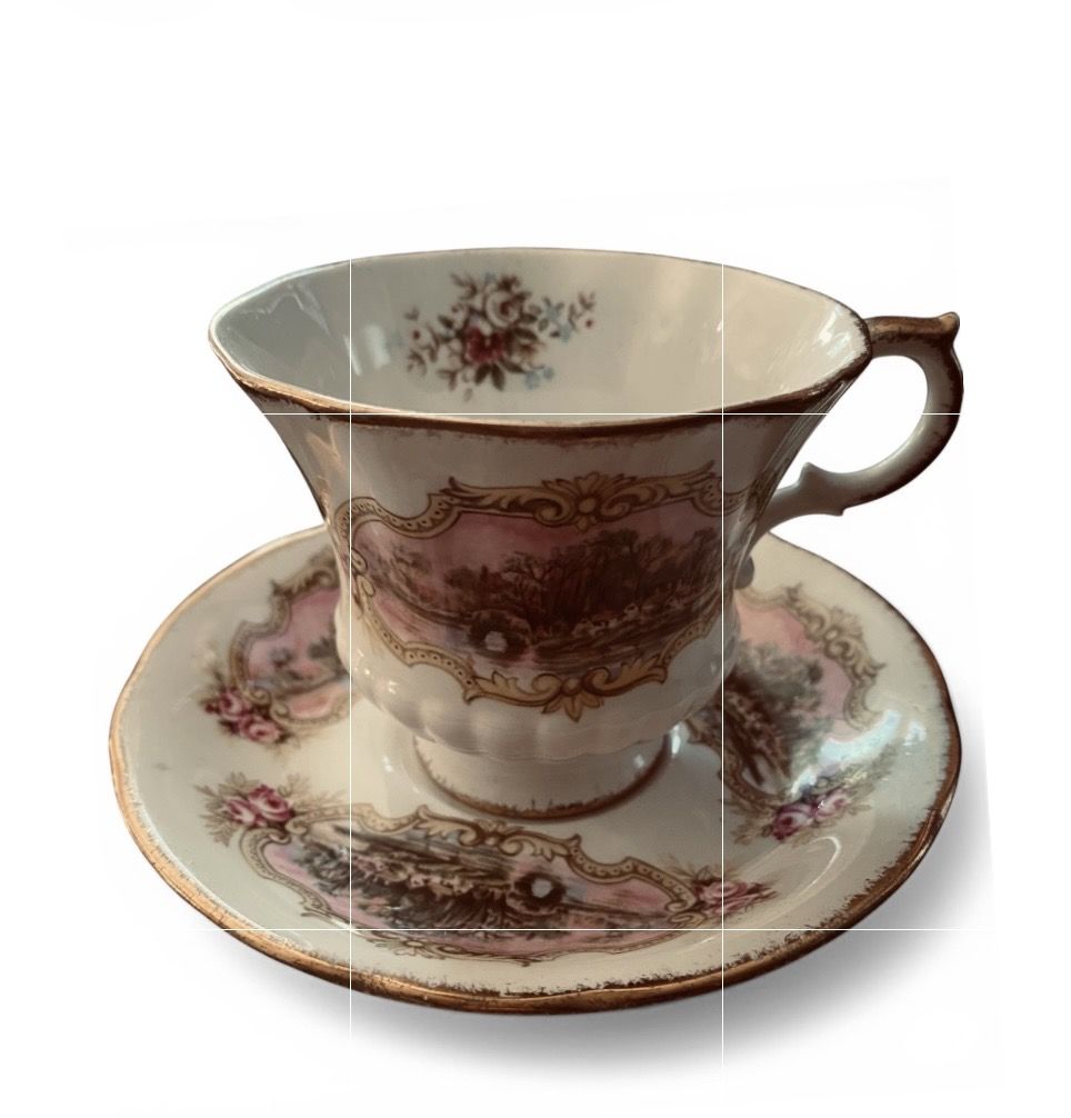 Vintage Paragon fine bone china teacup and saucer set. It is made by Paragon China, a brand known for high-quality English bone china. The specific pattern is known as "Chippendale". The set features a transfer decoration of a country village or landscape scene, framed by yellow scrolls and pink roses. There is also a floral bouquet design on the interior of the cup. The teacup has a footed design with a high-rise handle and brushed gold accents on the rims, handle, and pedestal base. The saucer has a softly scalloped rim with a coordinating decoration repeated three times