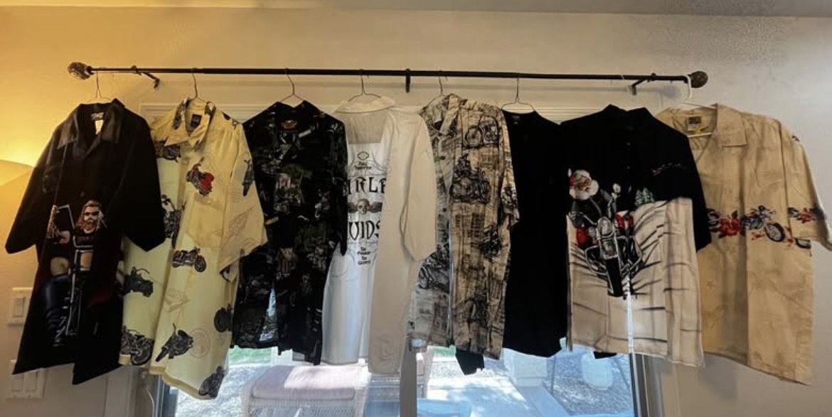 Like new mens Harley Davidson shirts, two are not Harley brand. Some are brand new or only been worn once, and have only ever been dry cleaned. XL-2XL $30 each