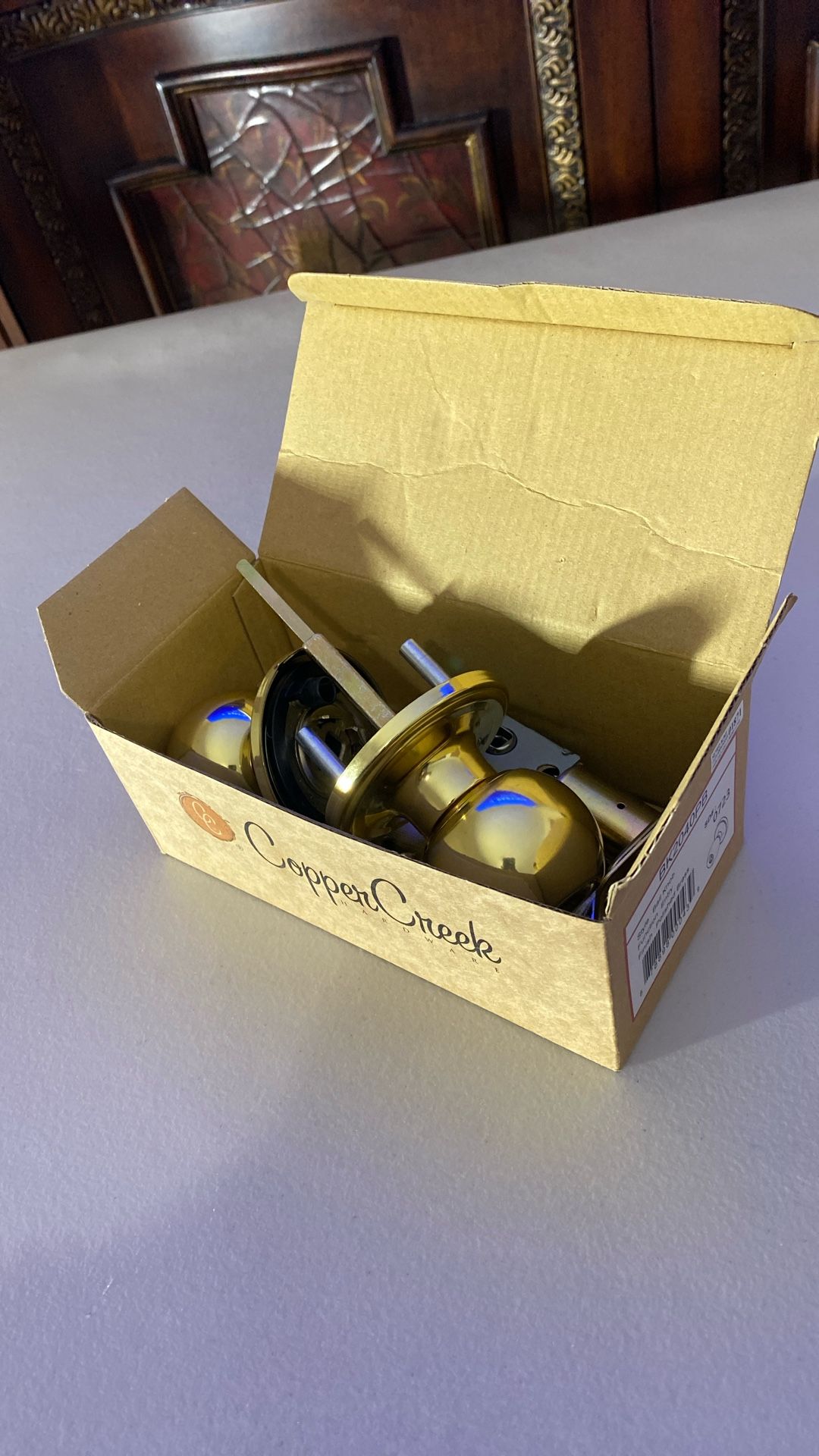 Never used copper Creek entry door knob. Polished brass entry door knob with two keys. Keyed entry door knob. Keyed entry handle with lock and key. Use for interior or exterior entrance doors.