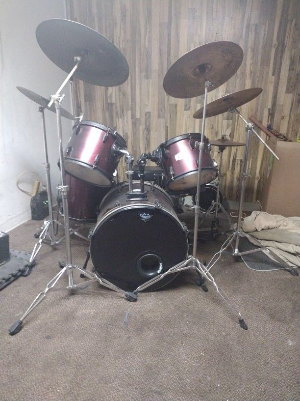 5 piece pearl drum kit with 5 zelgin symbols and hardware .and drum seat all in good shape.