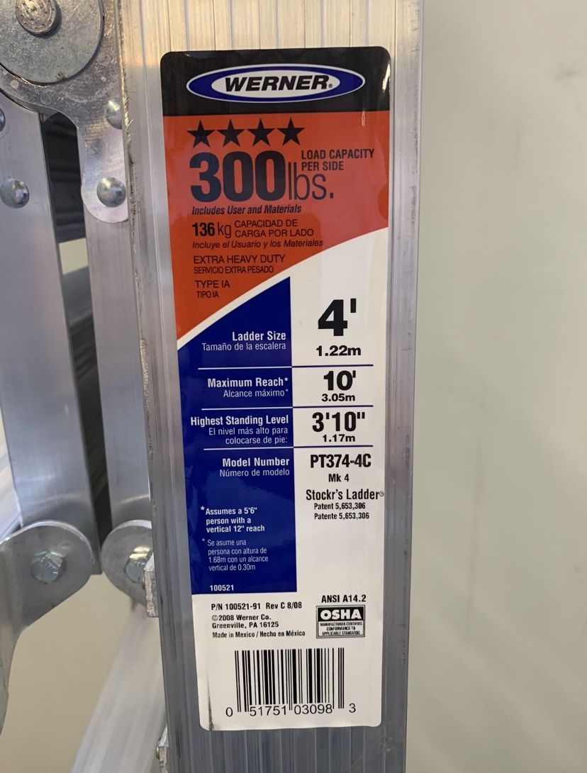 Werner PT374-4C ladder. I have 10 of these - about 4 of them have the foam taken off and tested, the rest are still banded and brand new. Purchased the wrong ladder - my loss your gain! $200 per ladder. $1900 all 10. Retailing for more than what I’m listing. selling as a lot(10). Will happily consider OBO! Thanks, L
