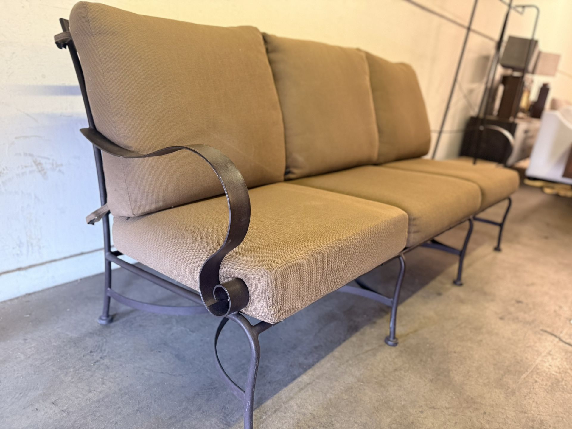 Gorgeous comfortable patio sofa by OW Lee. If you are not familiar with the company PLEASE do your research ! VERY EXPENSIVE STUFF! This sofa alone retails for MORE the 3.5K!! Only flaw is a patched area on one of the cushions. Not noticeable from the front. The quality is unreal! Very nice!! FROM WEBSITE Classico Sofa by Ow Lee Classico offers extremely comfortable seating in traditional wrought iron are beautiful design that's both visually appealing and supremely comfortable Dimension: Width/Diameter : 77.5″ Depth/Length: 36.5″ Height: 38.75″ Seat Height: 18″ Arm Height: 26.5″ Weight: 130 lbs Classico offers extremely comfortable seating in traditional wrought iron. Galvanized steel strapping make up the seat and the back and decorative rivets connect the beautifully interwoven straps together. Arms made of embossed flat bar complement the galvanized steel frame. Classico is a full-line collection that features dining, deep seating, chaise lounge options, counter stools, and table bases. Additionally, Classico’s deep seating features our Plush Comfort cushions.