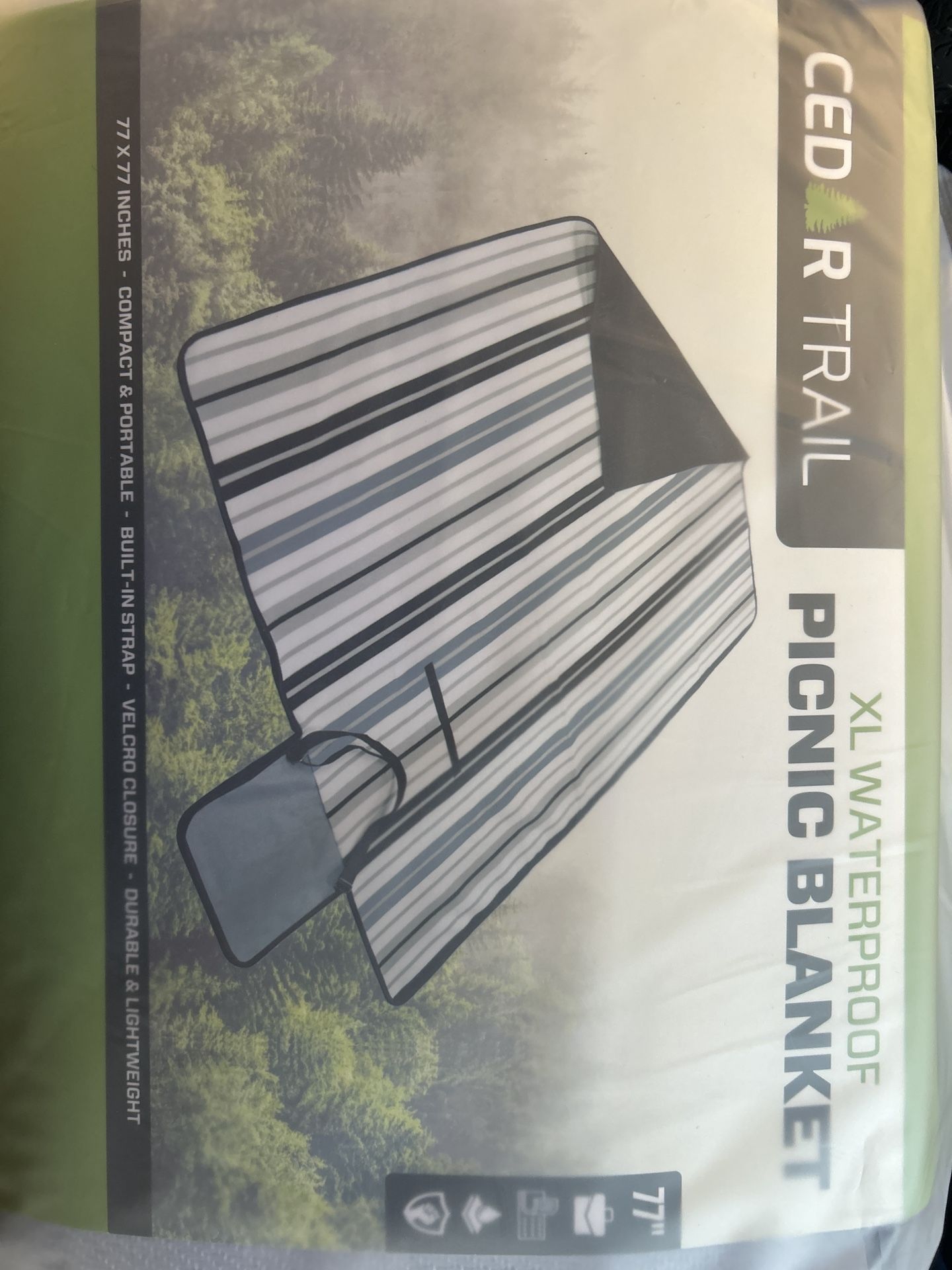 77x77 inches, compact and portable with built in strap an Velcro closure durable and lightweight