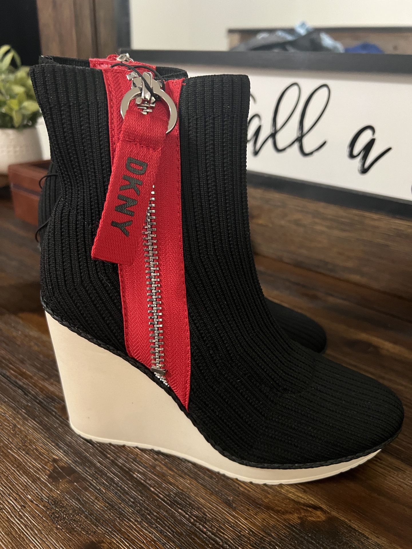 DKNY wedge boots. 3 inch rubber heel with 1/2 inch platform. Black fabric knit material with rubber heel.