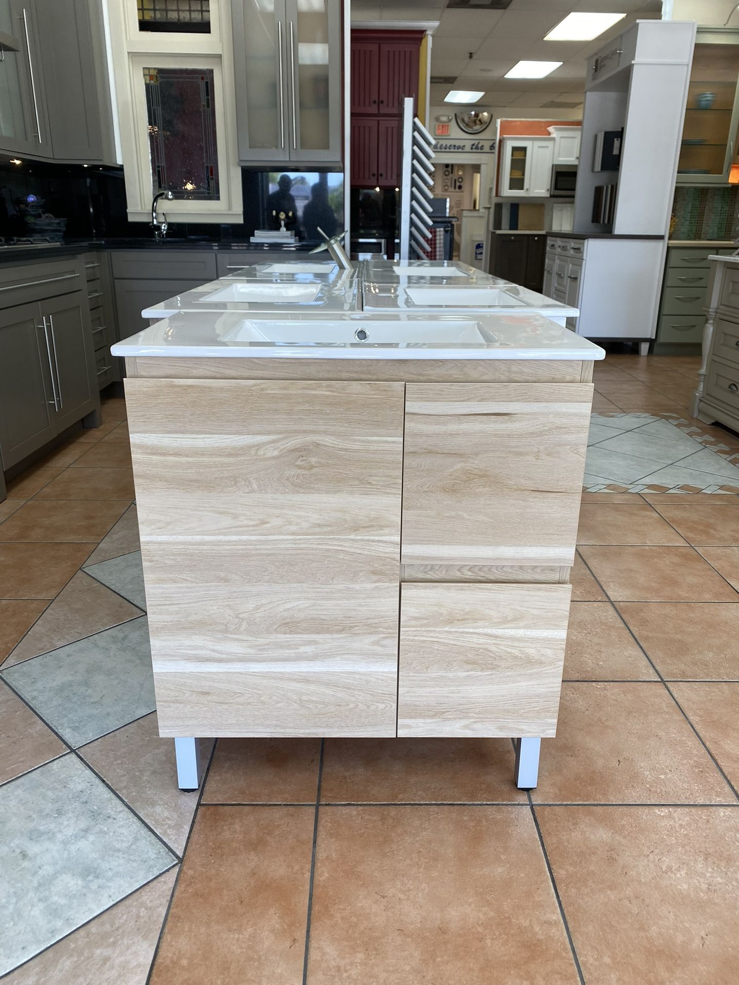 BRAND NEW Modern free standing Vanity Cabinet with ceramic or white 2" Resin countertop. PVC construction. Natural wood finish with two soft closing drawers and two soft closing doors. 30 inches width 35 inches height 18 inches depth Ready for pickup so OFFER UP :) ** Package deals available with faucets, toilets, LED mirrors, shower sliding doors and much more **