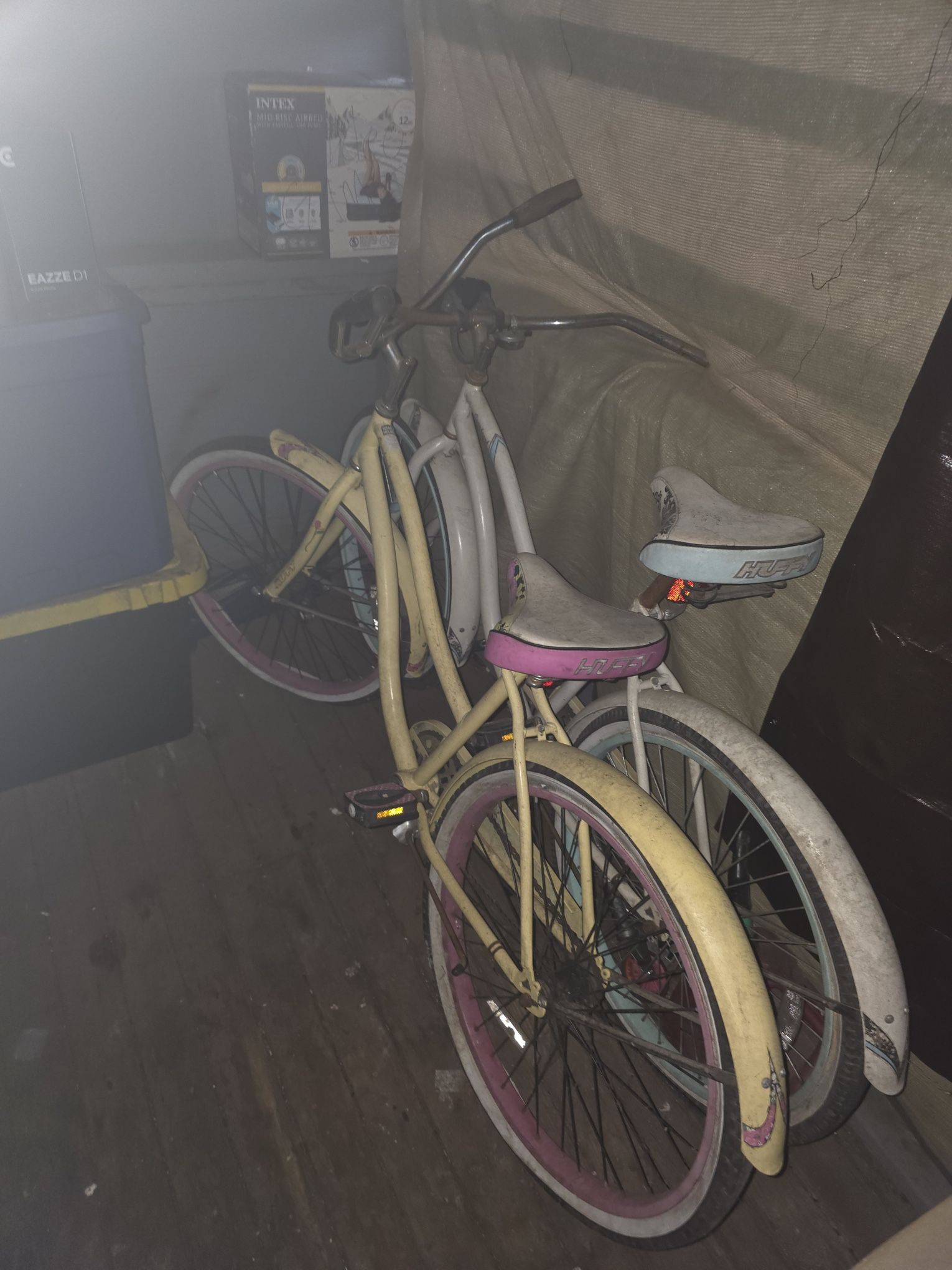 the brand is huffy. i havent gotten to cleaning them up and they are just taking space. they have alittle bit of rust on them and the inner tubes are missing. other than that they are rideable.