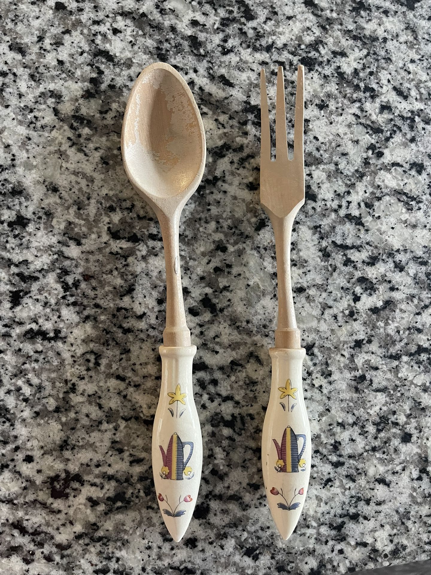 Vintage Porcelain and Wood Fork and Spoon Serving Set
