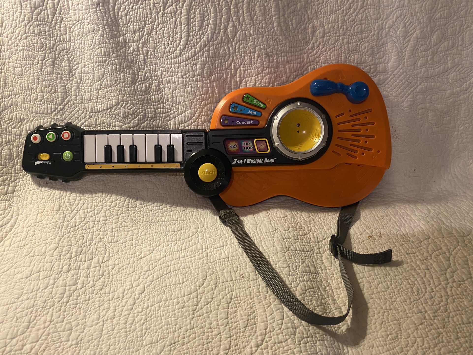 Like new condition Three ways to play, piano, drum and guitar Folds to become a piano or guitar Records your child’s music which they can then play back. Three musical styles jazz hip-hop and rock