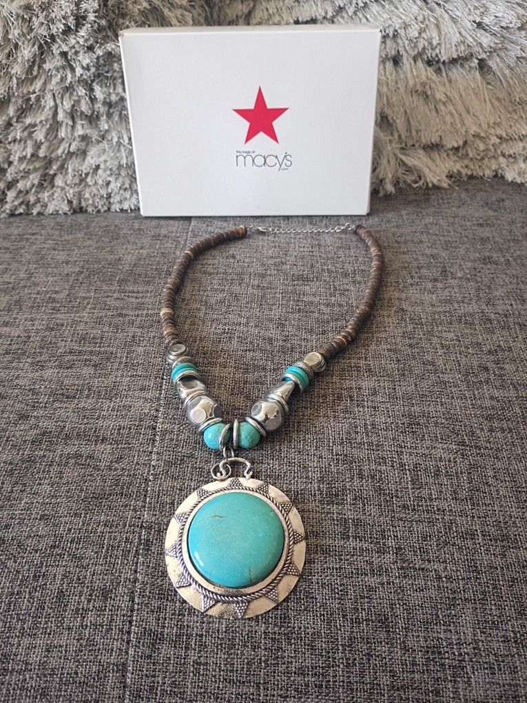 Elegant turquoise and silver pendant necklace with brown beaded accents. Perfect for adding a touch of color to any outfit. Like new no chips or cracks it's really beautiful again it's a Modern style defines this Stunning Silver Necklace c/w Sun Design Turquoise Stone and Setting - Decorative Cedar Necklace Size: Chain Length 50cm / Charm 7.0cm Color: Silver & Turquoise See pictures for more details