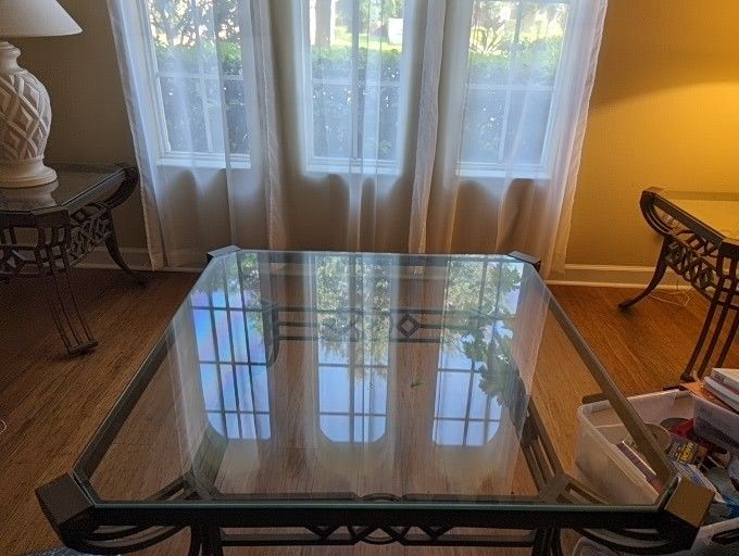 The coffee table is 19.5 inches tall and 43 inches wide. The 2 end tables are 23 inches tall and 29 inches wide. Very good condition Located by the Florida mall Pickup only