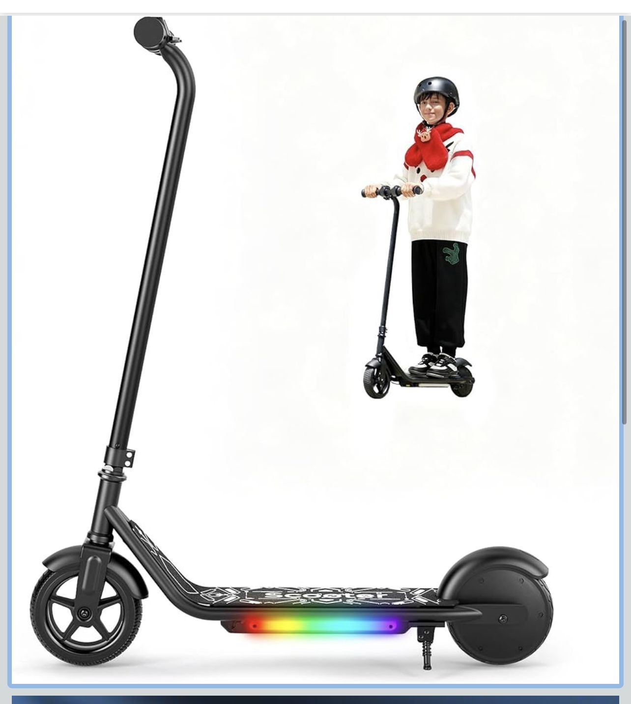 Brand new in the box Electric Scooter for Kids, 150W Motor, Simple One-Button Control, 2 Safe Speeds (6/10 MPH), Colorful Lights, Magnetic Charging, Dual Brake System, Ideal Presents for Boys & Girls Color black Age Range (Description) kids Special Feature Lights Weight Limit 154 Pounds Product Dimensions 31.1"L x 5.9"W x 15"H One Button, All Control: Based on the principles of simplicity and safety, this kids scooter eliminates the need for children to look down at the screen or operate multiple buttons, allowing them to focus on the riding environment in front of them and improving riding safety. Simple and intuitive controls make for safer fun (The button can be used to control power on/off, lighting, and riding mode) 2 Safe Speeds (6/10 MPH): Our electric scooter features a reliable 150W motor with 2 kid-friendly speed modes (6/10 MPH). Unlike scooters with multiple complex settings, K2 keeps it simple and safe——fast enough for fun, easy enough for riders to handle with confident Kid-Friendly Magnetic Charging: Specially designed for kids, the magnetic charger snaps into place with ease—no fiddling required. It auto-detaches to prevent accidents, protects the charging port from wear, and keeps the connection neat and dust-free for safer, longer-lasting fun Dual Braking System: Equipped with both front and rear brakes, the scooter offers double the safety for your child. This responsive braking system ensures smooth stops, giving kids extra confidence and parents greater peace of mind Fun and Safe Colored Ambient Lights: The scooter also features bright colored lights that light up the path ahead, making every ride exciting and playful while keeping your child bright and safe during evening or low-light adventures