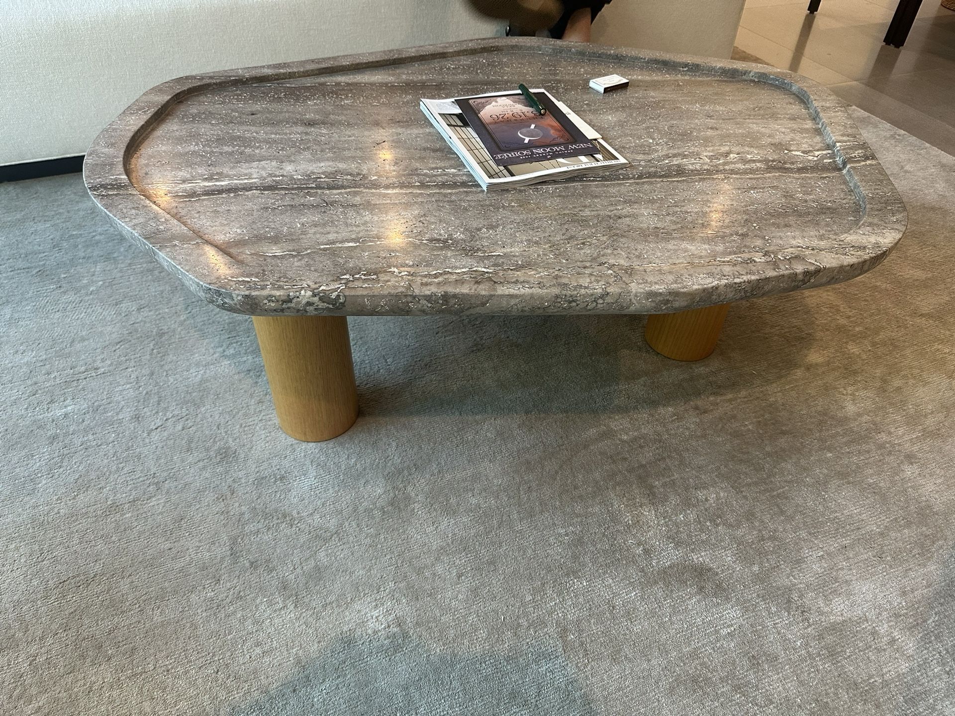 Travertine table top, three ash and oak legs 45”L x 32”W x 16”H Paid $2100 for it new, asking $350 You pick up in West Hollywood