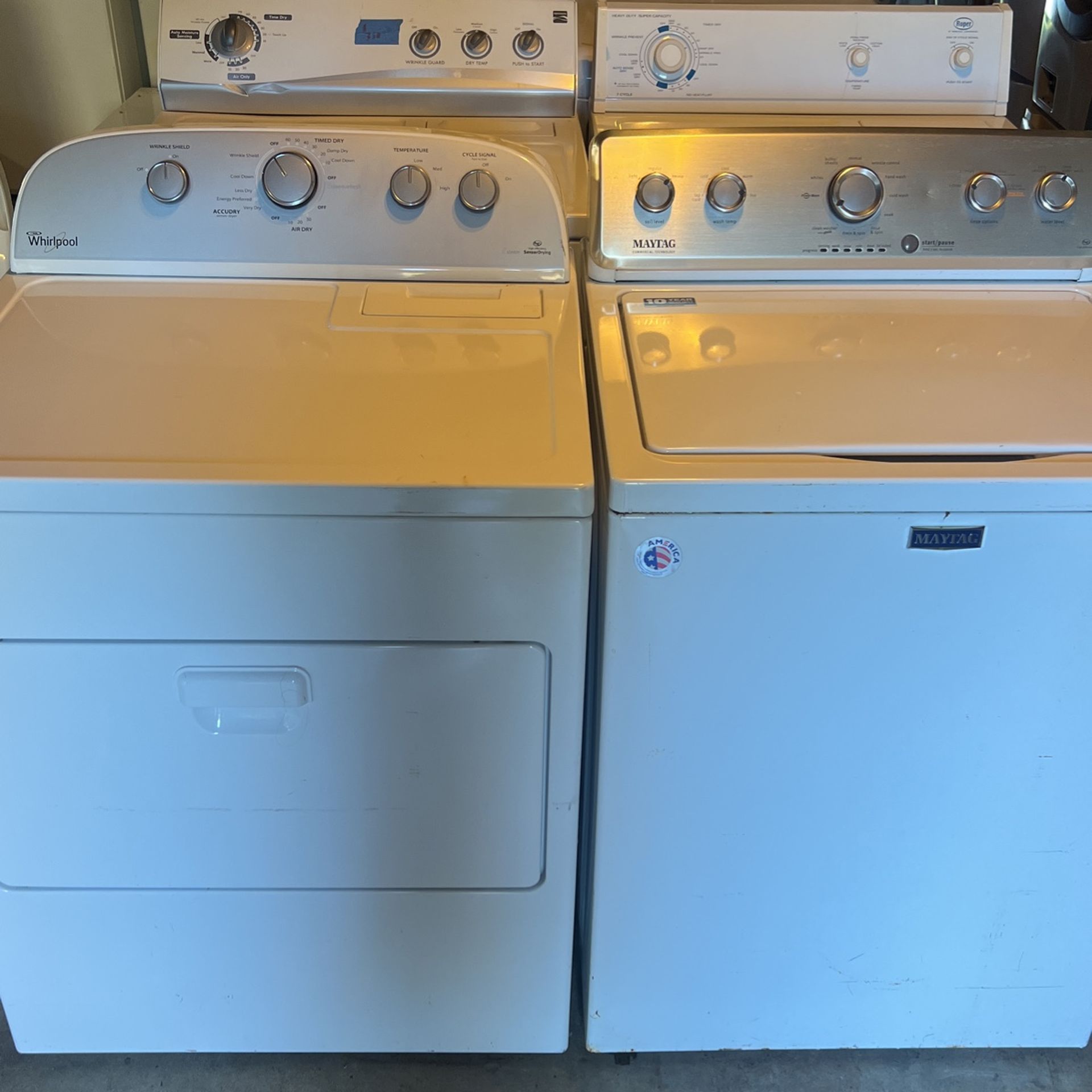 Washer and dryer steam all the potion one years old Both units come with one year, factory warranty, and one year from us warranty. That’s two years together. We are on Briarcreek between Raleigh and Durham. Small fee delivery.