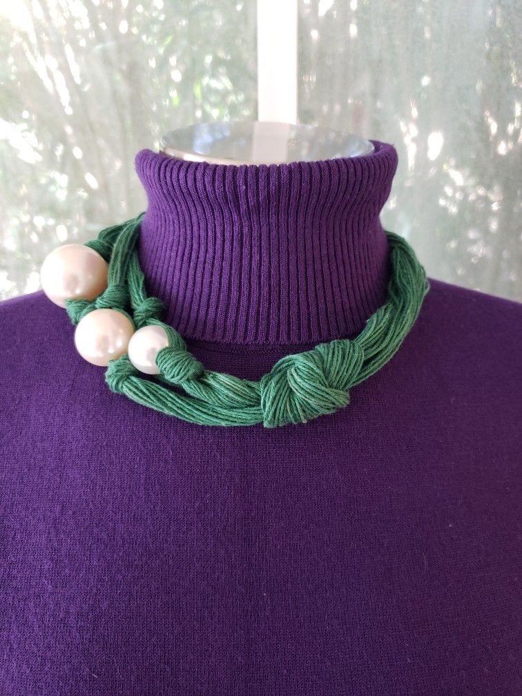 19 in. From cotton thread and glass pearl. Looks so pretty. You always will have a lot compliments.