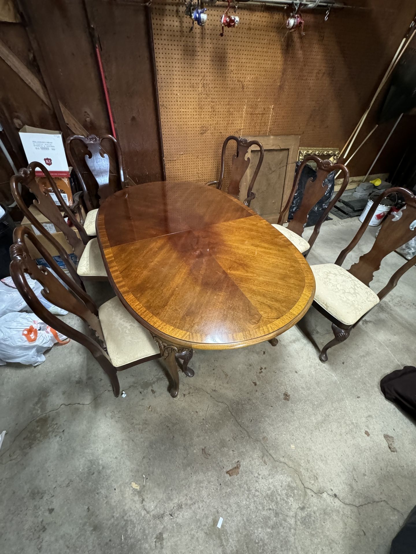 *Open to Offers* *Must Move Soon!* Beautiful Thomasville Queen Anne dining set, featuring a solid wood oval table with a glossy finish and six elegant chairs. This high-end set includes two armchairs and four side chairs, all with intricate carved details and comfortable upholstered seats in a classic damask fabric. Also included is the original table leaf. 🔹 Condition: Amazing condition, very few scratches