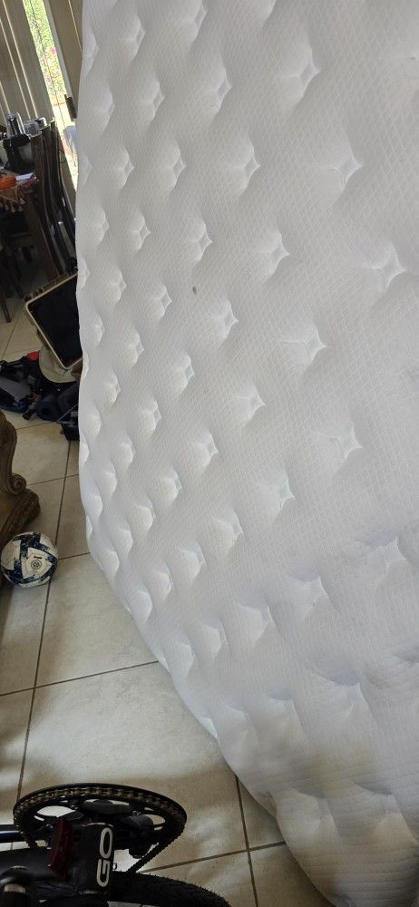 Year old. Light use. A bit dusty from the move. Includes full size bed frame