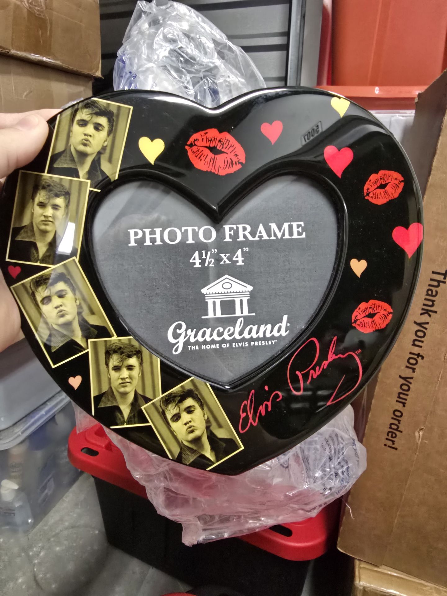 You’re getting an Elvis Presley Photo frame.This is from Elvis Presley place at Graceland. The frame has wonderful pictures on side and lips kisses on the other. It also has the Graceland label on back. I will meet at public or somewhere like that in Brooksville, or we can come up where to meet.