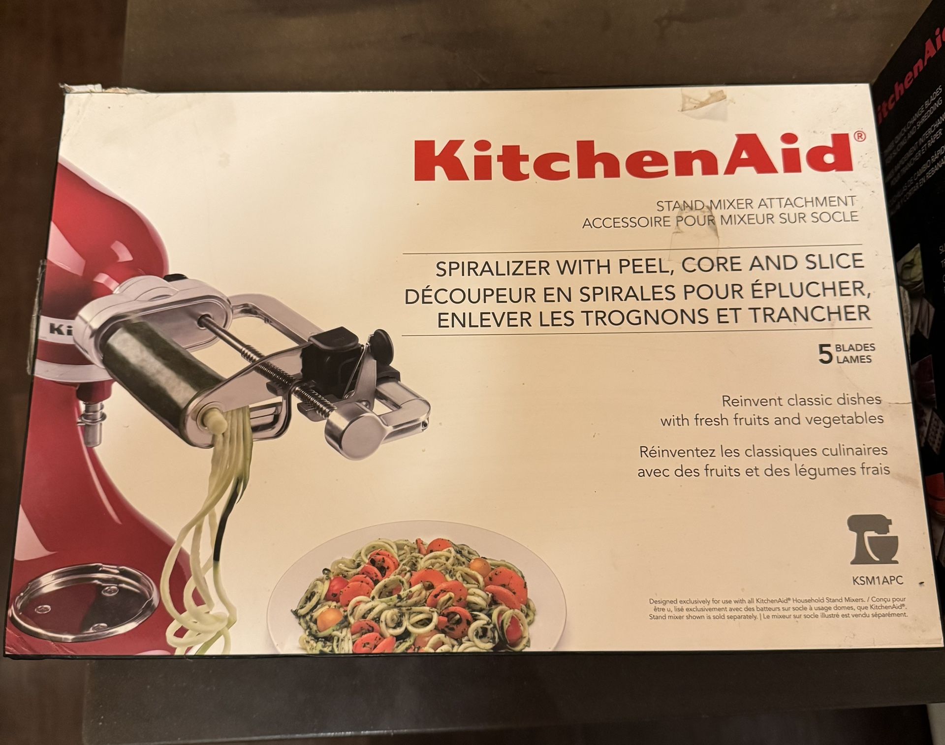 5‑Blade KitchenAid Spiralizer Attachment – Includes blades for peeling, coring, slicing, and spiralizing vegetables and fruits. Lightly used, clean, and in great condition. Mixer not included.