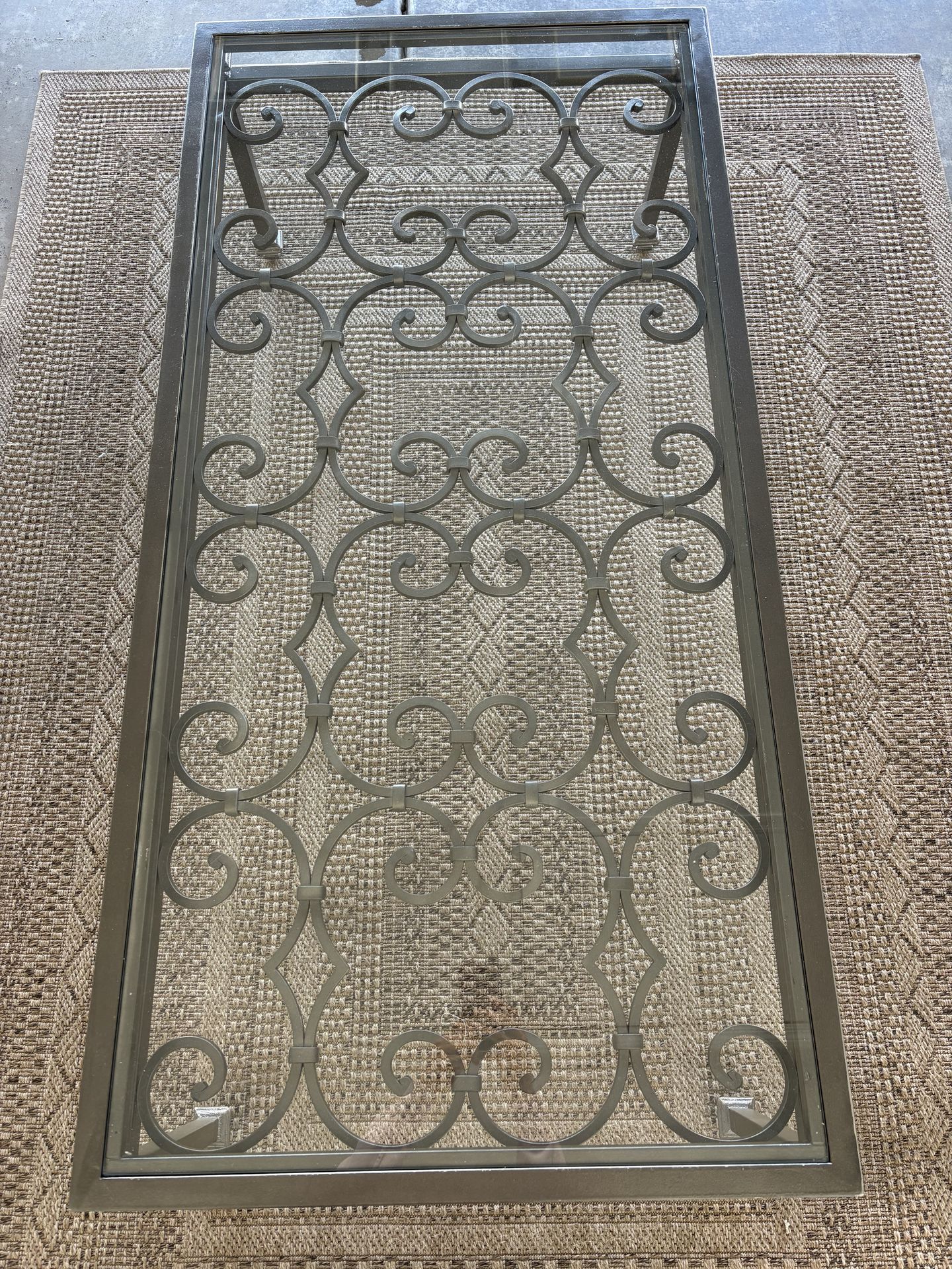 I am selling a wrought iron coffee table with dark brown base and glass top. It is heirloom quality and very heavy. It measures 26x53x16. Cash only, please.