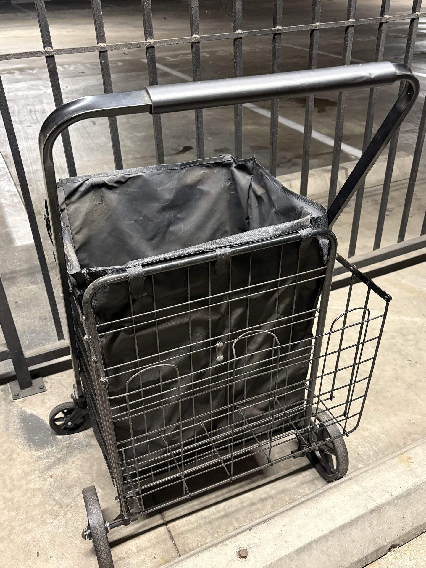 VEVOR Folding Shopping Cart with Removable Waterproof Liner, 330LBS Large Capacity Jumbo Grocery Cart with Dual Basket, 360° Swivel Wheels, Dense Metal Mesh Base, Heavy Duty Utility Cart for Shopping 25.12"D x 41.46"W x 26.06"H Intensive Mesh Bottom & Waterproof Liner: The upgrade wire mesh bottom and reinforce bar allows you to carry 330lbs weight and it does not bend ! The included black liner is made of 600D Oxford cloth with PVC coating, which is durable and waterproof, it can effectively prevent small items from falling and protect your privacy. Purchased in 2024 for $60 Barely used Just dusty