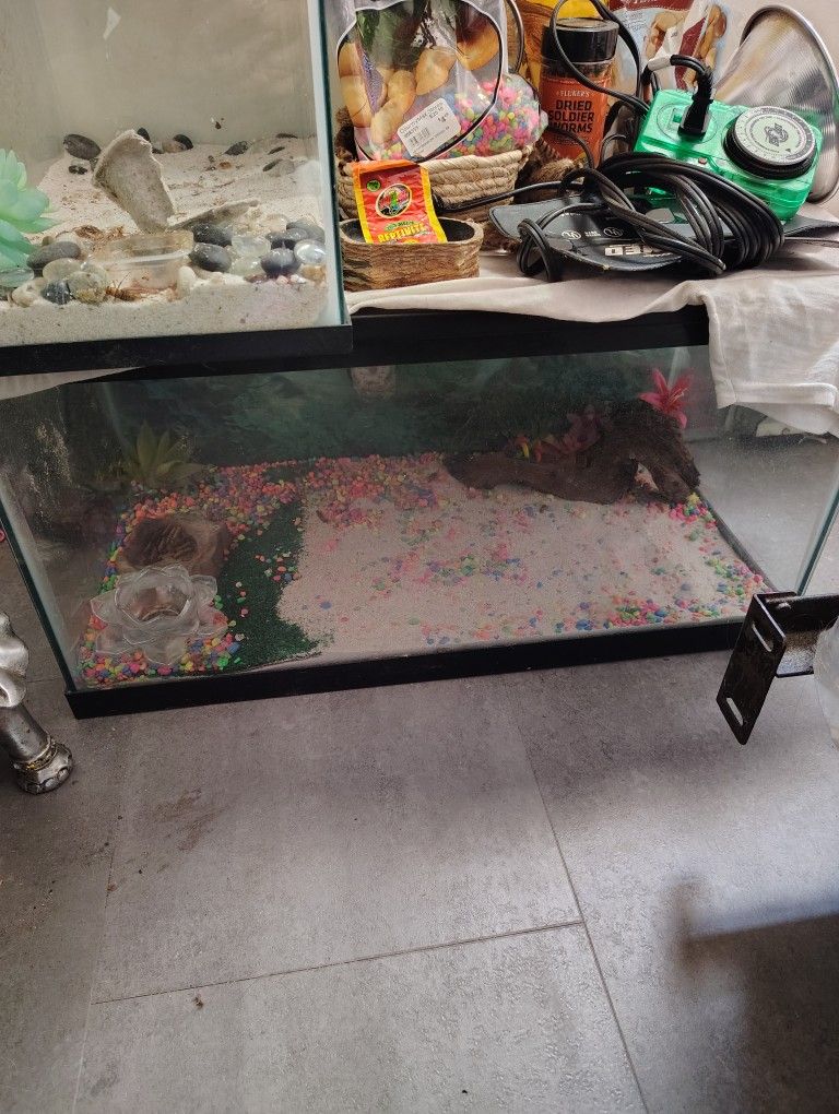 I have 2 used tanks, 2 heating pads, a light bulb holder (needs new light bulb depending on pet needs), also comes with a working automatic timer, dried worms (just bought 2 weeks ago), bowls, rocks, decorations, and even some extra sand for reptiles. (None of these supplies are necessarily for fish!) My pet lizard just passed after a few good years... he was healthy all along just passed. Should deep clean though to not spread possible disease RIP Shawdy Sh!+ Stains, Sh!++y for short 🤍