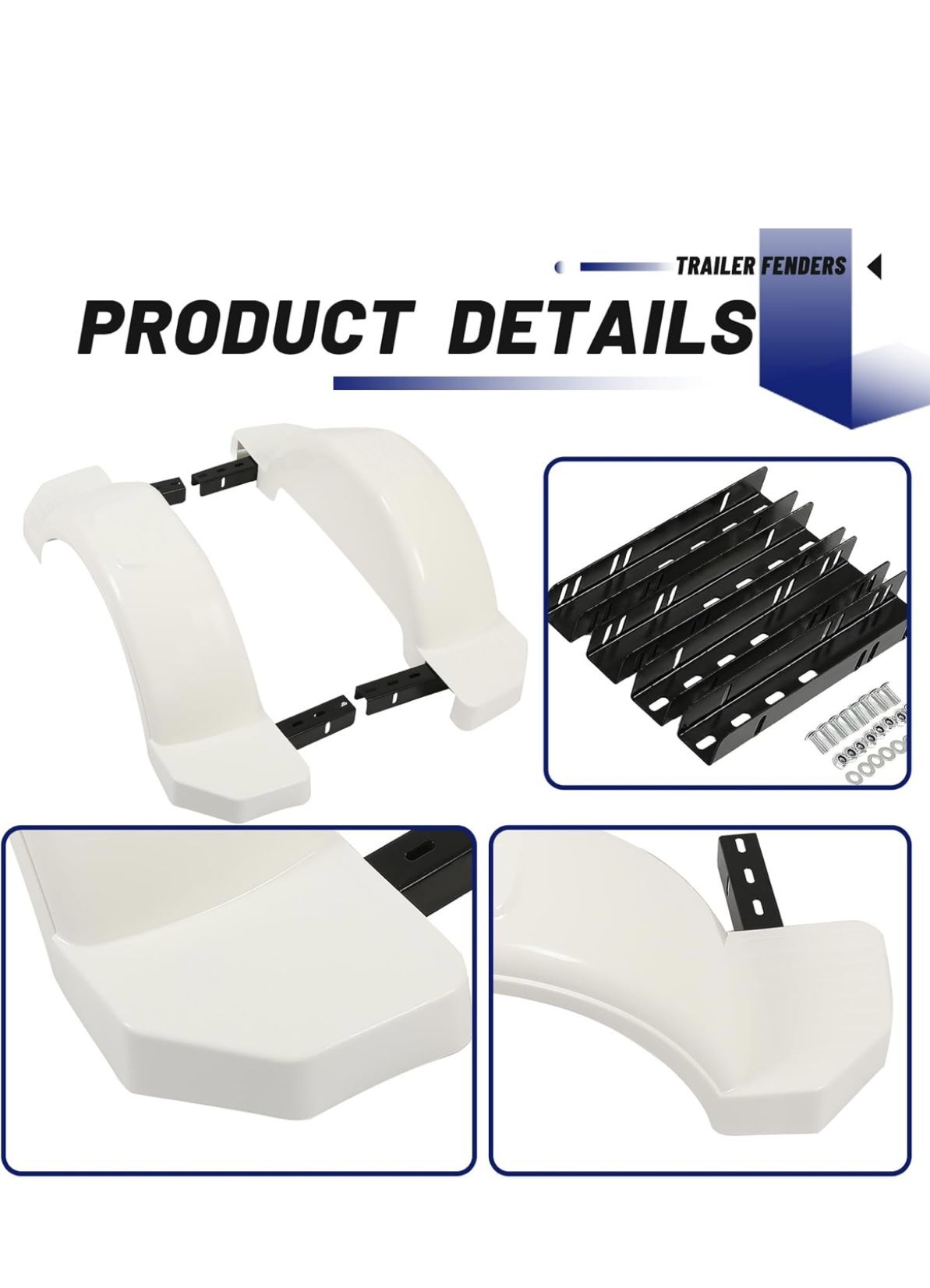 Fits single-axle trailers w/ 13" diameter wheels. High density polyethylene (HDPE) fenders with Injection molded. Impact resistant, scratch resistant and UV-protected. Dimension: 39.7" long x 8.8" wide x 11.4" tall. Max Capacity: 300 lb